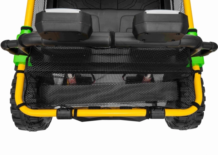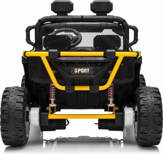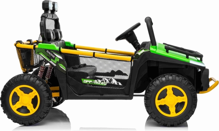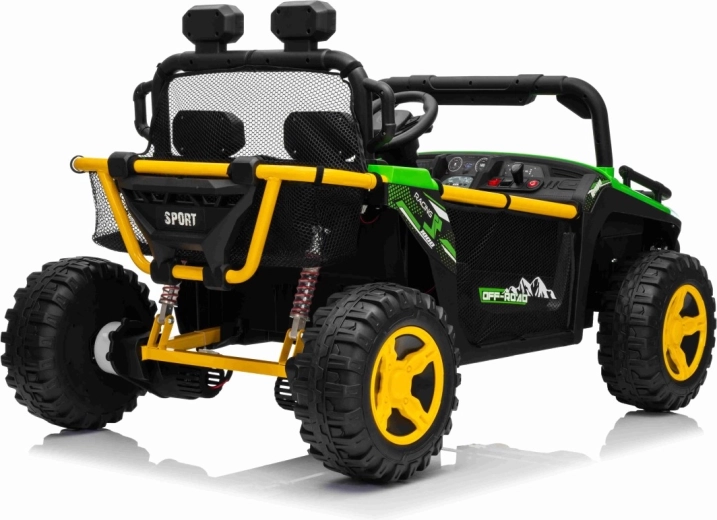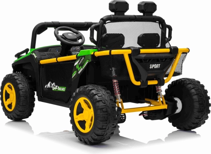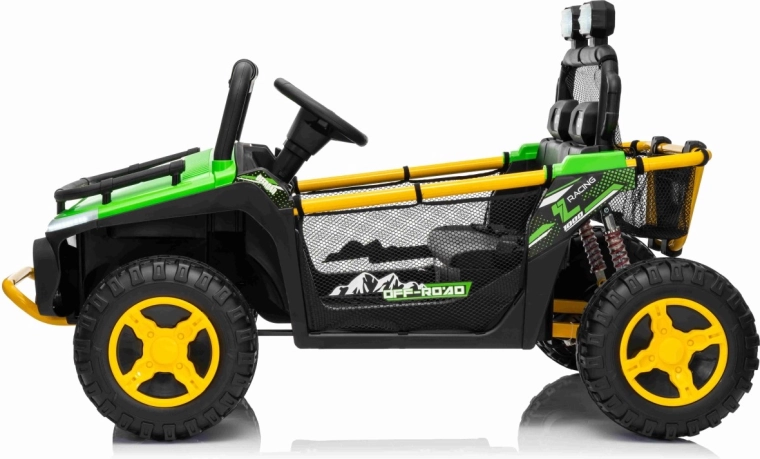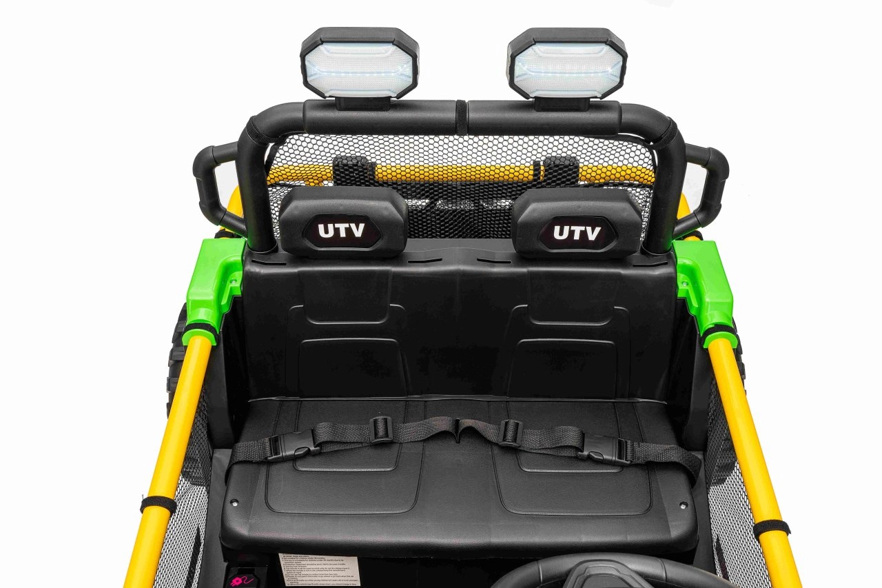 Robuuste elektrische kinderauto in UTV-stijl met een krachtige aandrijving 2×80 W, een 24 V 9 Ah accu en terreinwaardige EVA-banden voor soepel rijden buiten. Twee zitplaatsen met veiligheidsgordels, 2,4 GHz afstandsbediening met Stop-knop en LED-verlichting zorgen voor plezier én veiligheid. Het audiopaneel met Bluetooth/USB/MP3 en een praktische achtermand maken de uitrusting voor kleine avonturiers compleet.
