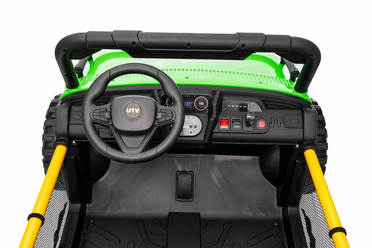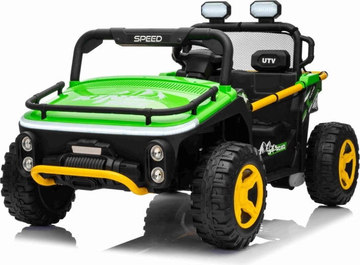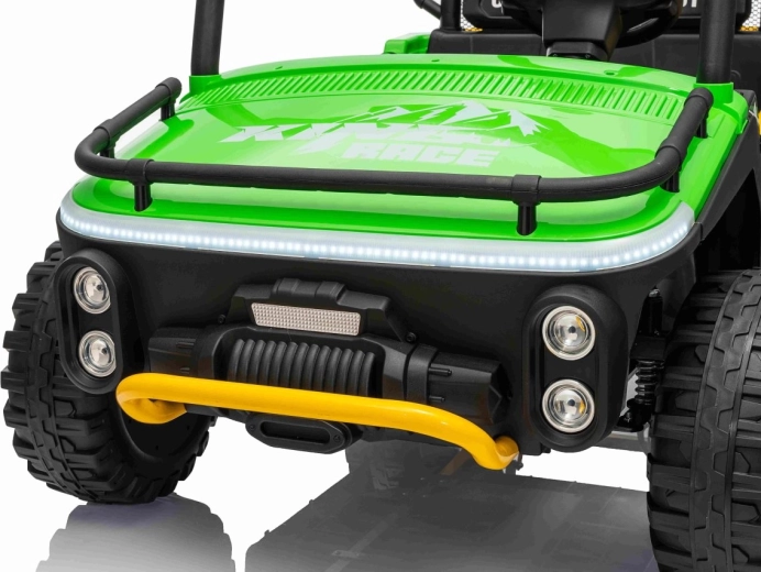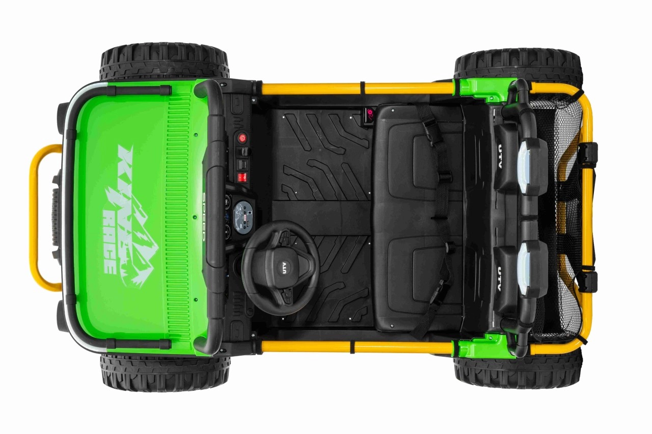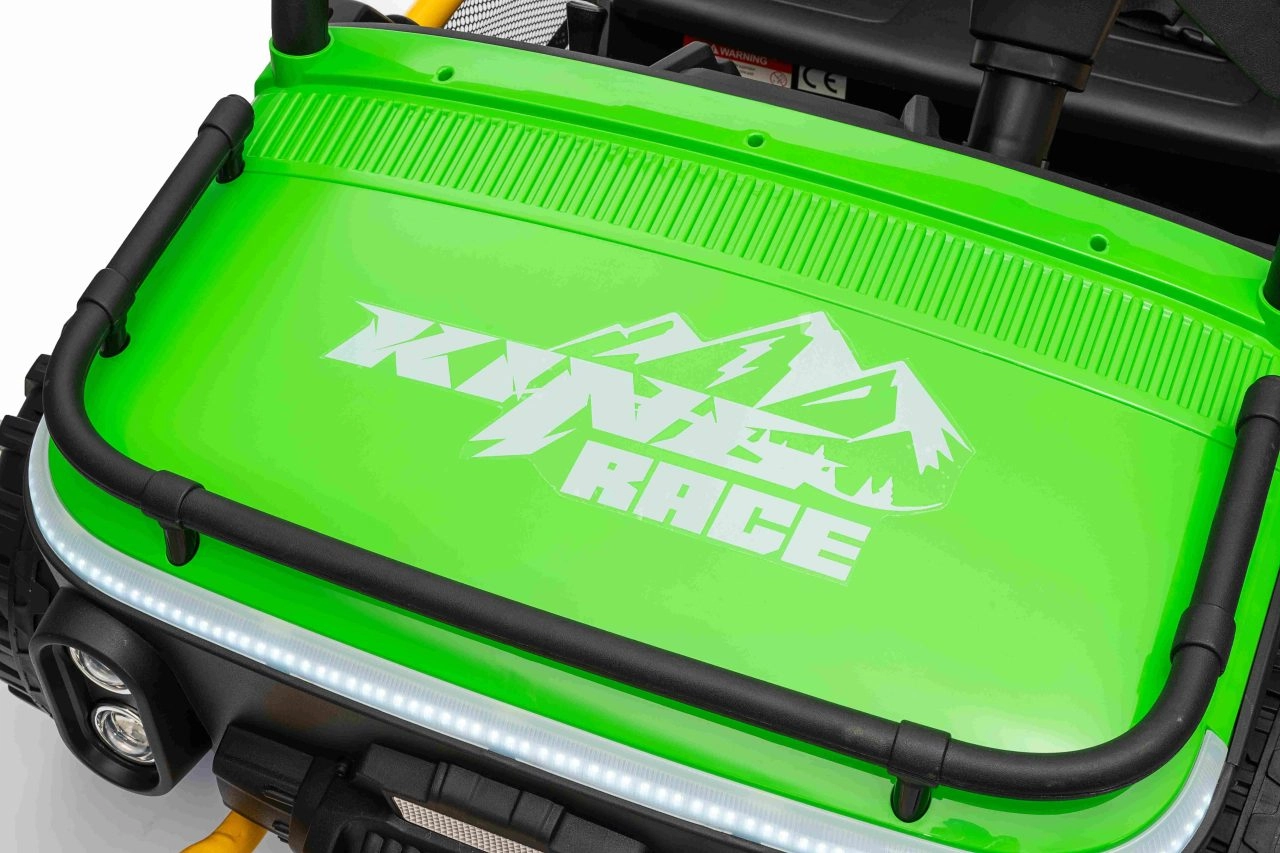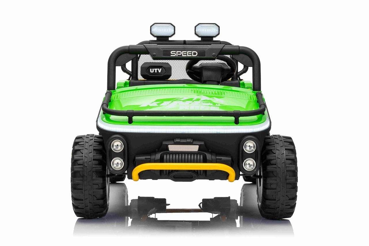 Ontdek offroad-plezier met de kinder-UTV SPEED. Dankzij de krachtige 2×80 W aandrijving en de hoge bodemvrijheid van 14 cm neemt hij oneffenheden moeiteloos, terwijl de grote EVA-banden 30×12 cm trillingen dempen en uitstekende grip bieden. Kinderen zijn onder de indruk van de voorste LED-koplampen en de bovenste lichtbalk, en ouders waarderen de 2,4 GHz afstandsbediening met drie snelheden en een nood-Stop-knop.