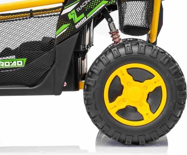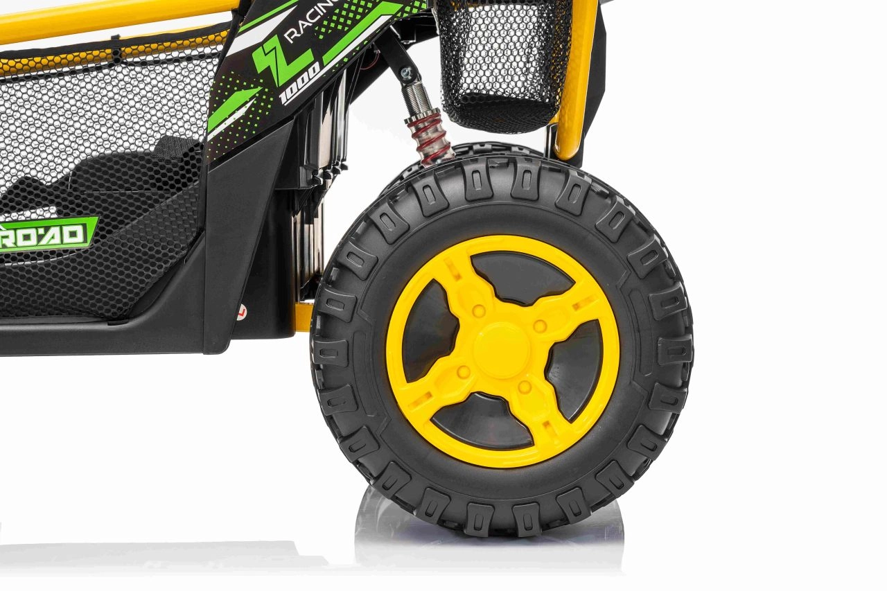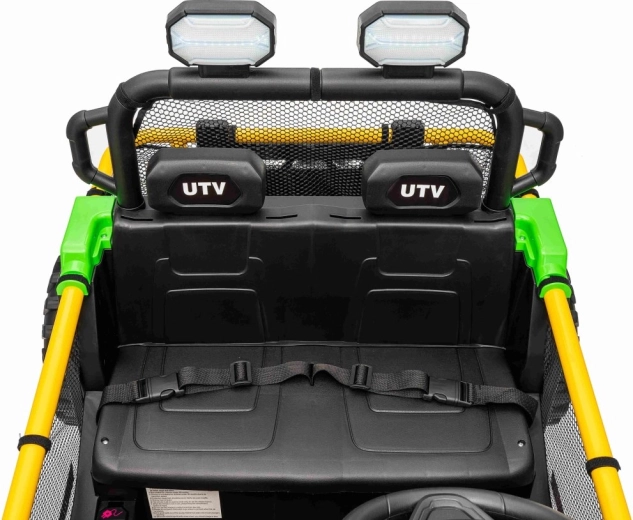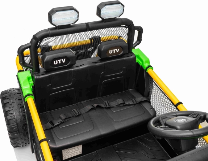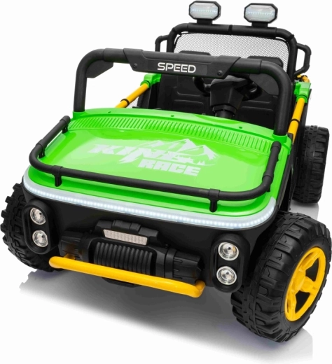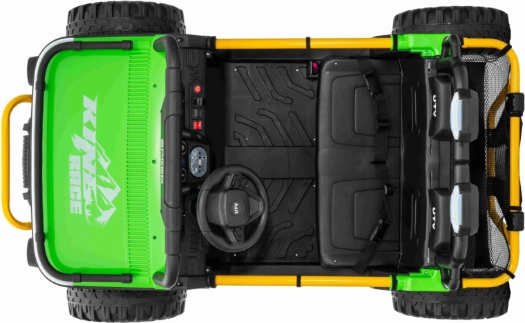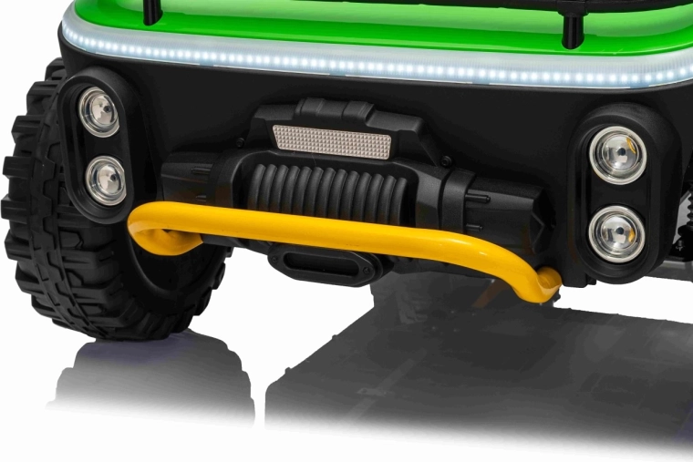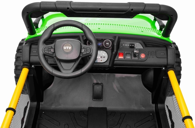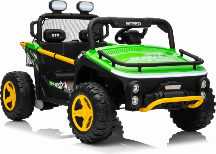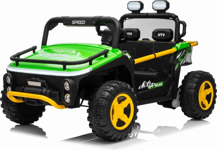 Ontdek offroad-plezier met de kinder-UTV SPEED. Dankzij de krachtige 2×80 W aandrijving en de hoge bodemvrijheid van 14 cm neemt hij oneffenheden moeiteloos, terwijl de grote EVA-banden 30×12 cm trillingen dempen en uitstekende grip bieden. Kinderen zijn onder de indruk van de voorste LED-koplampen en de bovenste lichtbalk, en ouders waarderen de 2,4 GHz afstandsbediening met drie snelheden en een nood-Stop-knop.