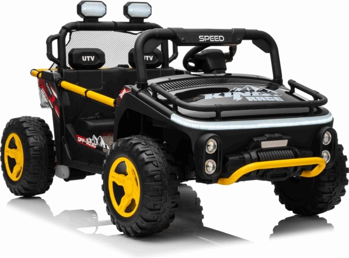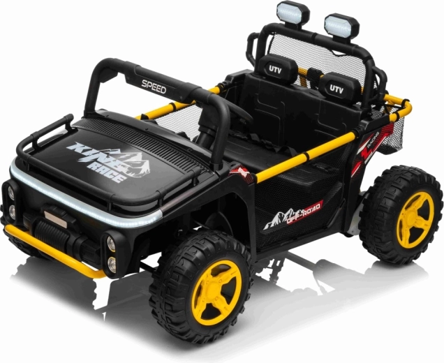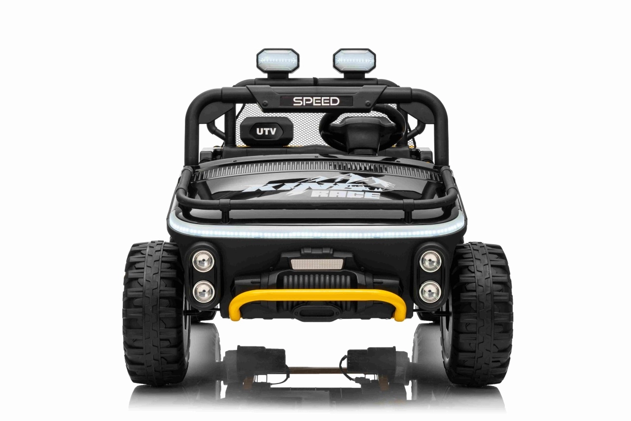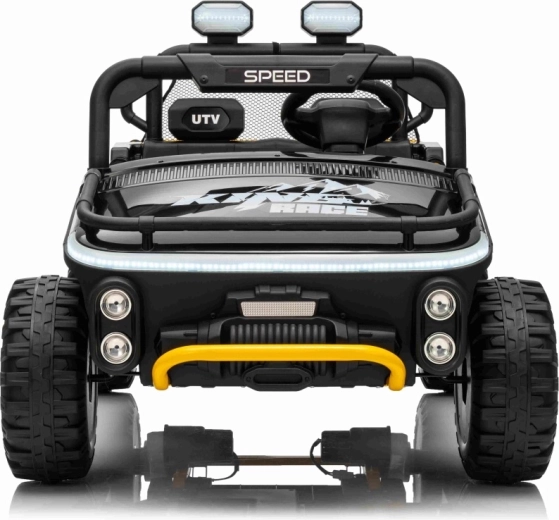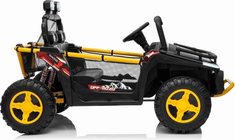 Robuuste elektrische kinderauto in UTV-stijl voor twee kinderen met twee krachtige motoren 2x80 W, een 24 V 9 Ah accu, zachte EVA-banden en onafhankelijke vering voor rijden in terrein. Voorzien van LED-koplampen, veiligheidsgordels, 2,4 GHz afstandsbediening met nood-Stopknop en een multimediapaneel met USB, MP3 en Bluetooth.