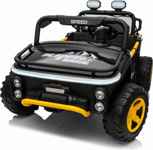 Voor veiligheid en controle is de wagen uitgerust met een 2,4 GHz afstandsbediening met 3 snelheden en een noodstopknop, veiligheidsgordels en een duidelijke laadstatusindicator. Dubbele zitplaatsen, hoge bodemvrijheid (14 cm) en een ruime achterkoffer bieden plaats voor langere ritten. LED-koplampen en de bovenste lichtboog verbeteren de zichtbaarheid en zorgen voor een aantrekkelijke look.
