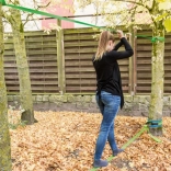 Slacklining is een geweldige activiteit die coördinatie verbetert en elke spier in het lichaam versterkt. De installatie is eenvoudig, je hebt alleen twee bomen in de tuin of in het park nodig waartussen je de riem kunt spannen. Beginners kunnen voor meer stabiliteit een geleidelijn gebruiken.