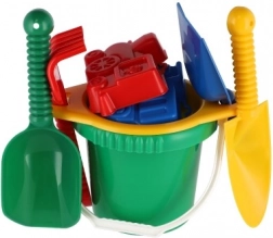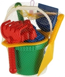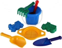 Bevat alle benodigde gereedschappen voor bouwen en creatief spel in het zand - een emmer, zeef, schepjes, harkjes en twee zandvormpjes.