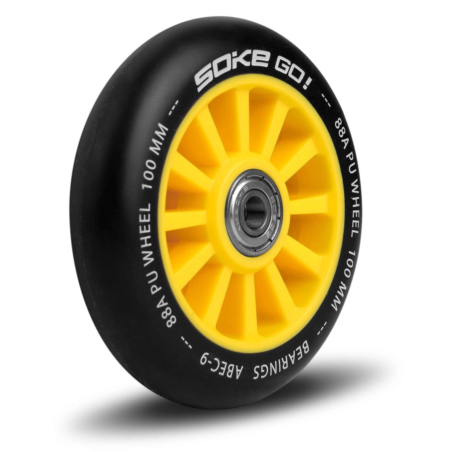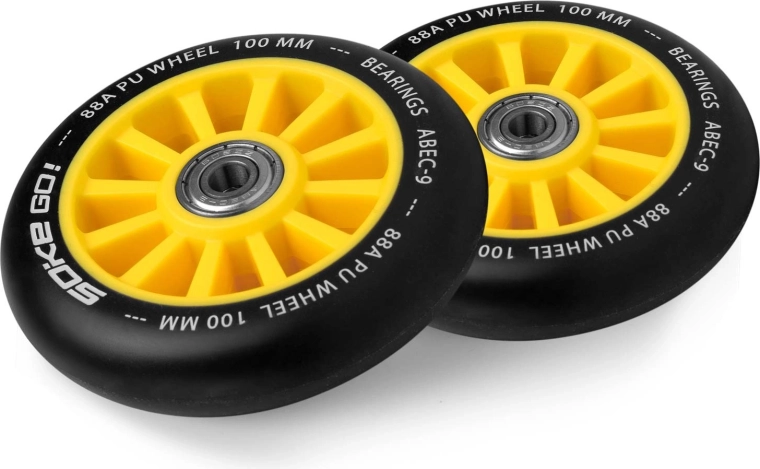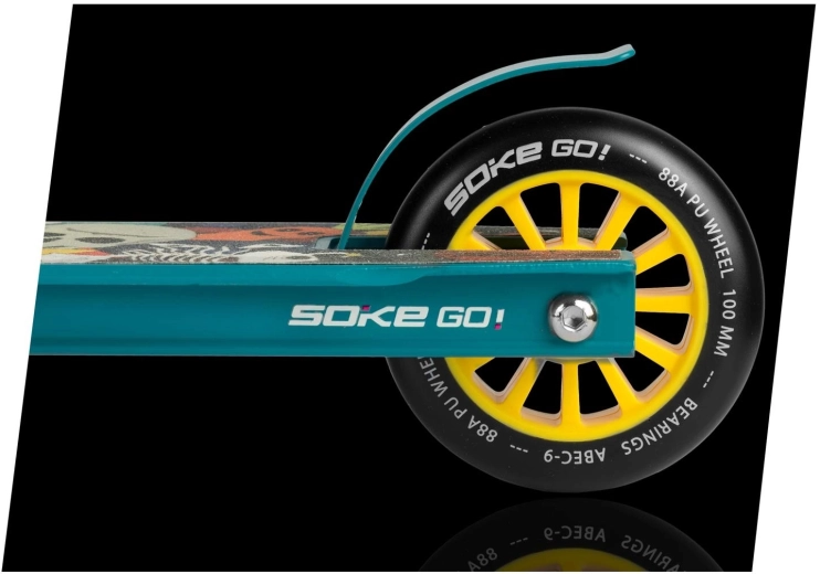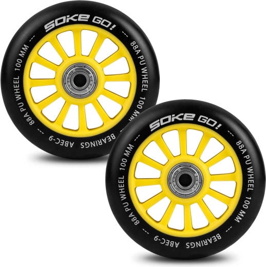 De gele SOKE-wielen van 100 mm combineren snelheid, duurzaamheid en betrouwbare grip. Het polyurethaan met hardheid 88A is gemaakt voor harde ondergronden zoals asfalt, terwijl de ABEC-9 lagers zorgen voor een soepele en snelle start.