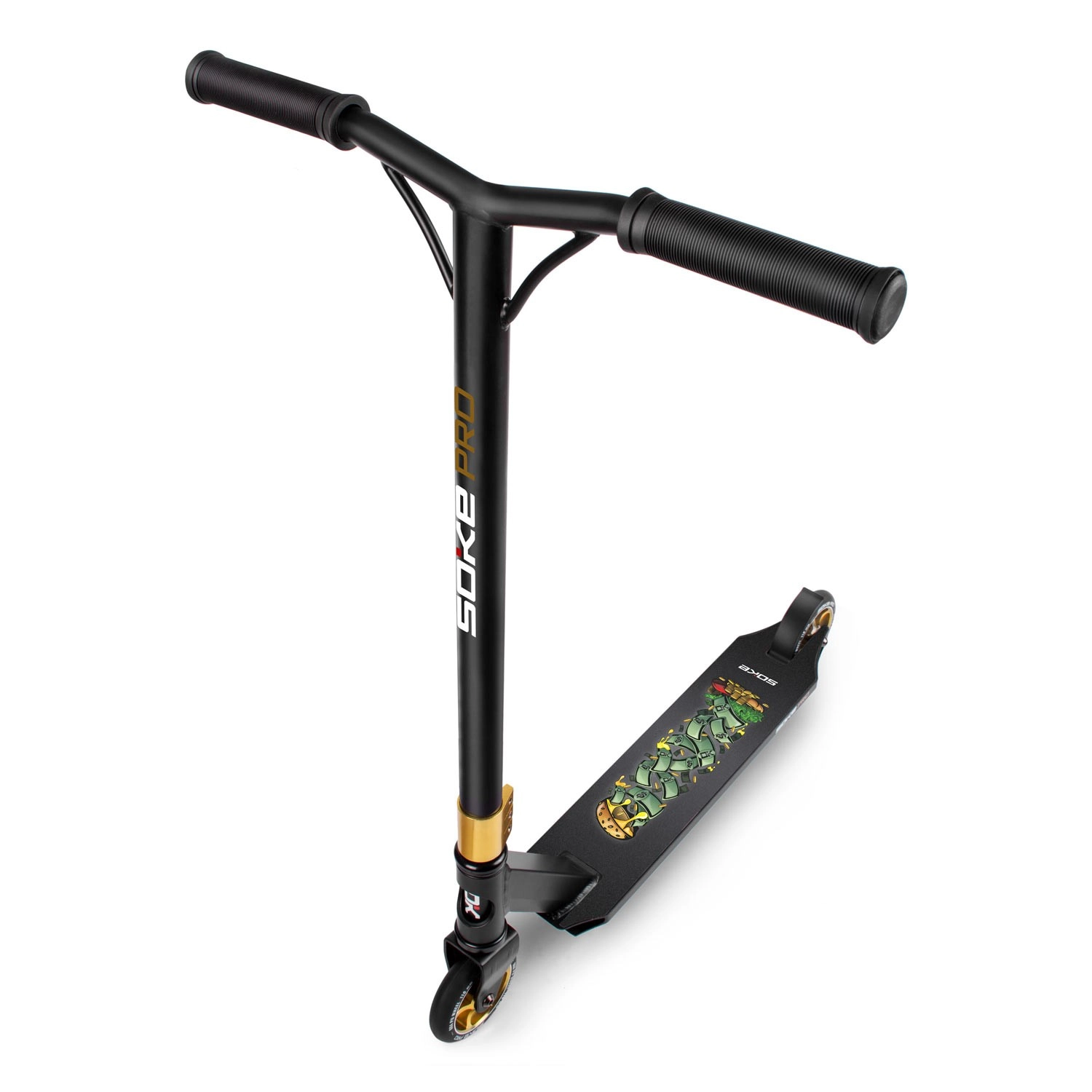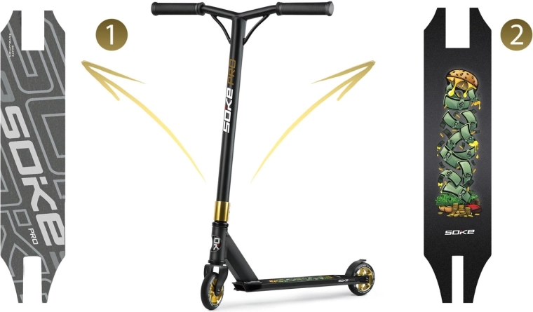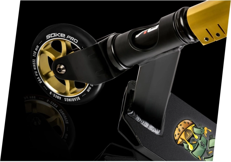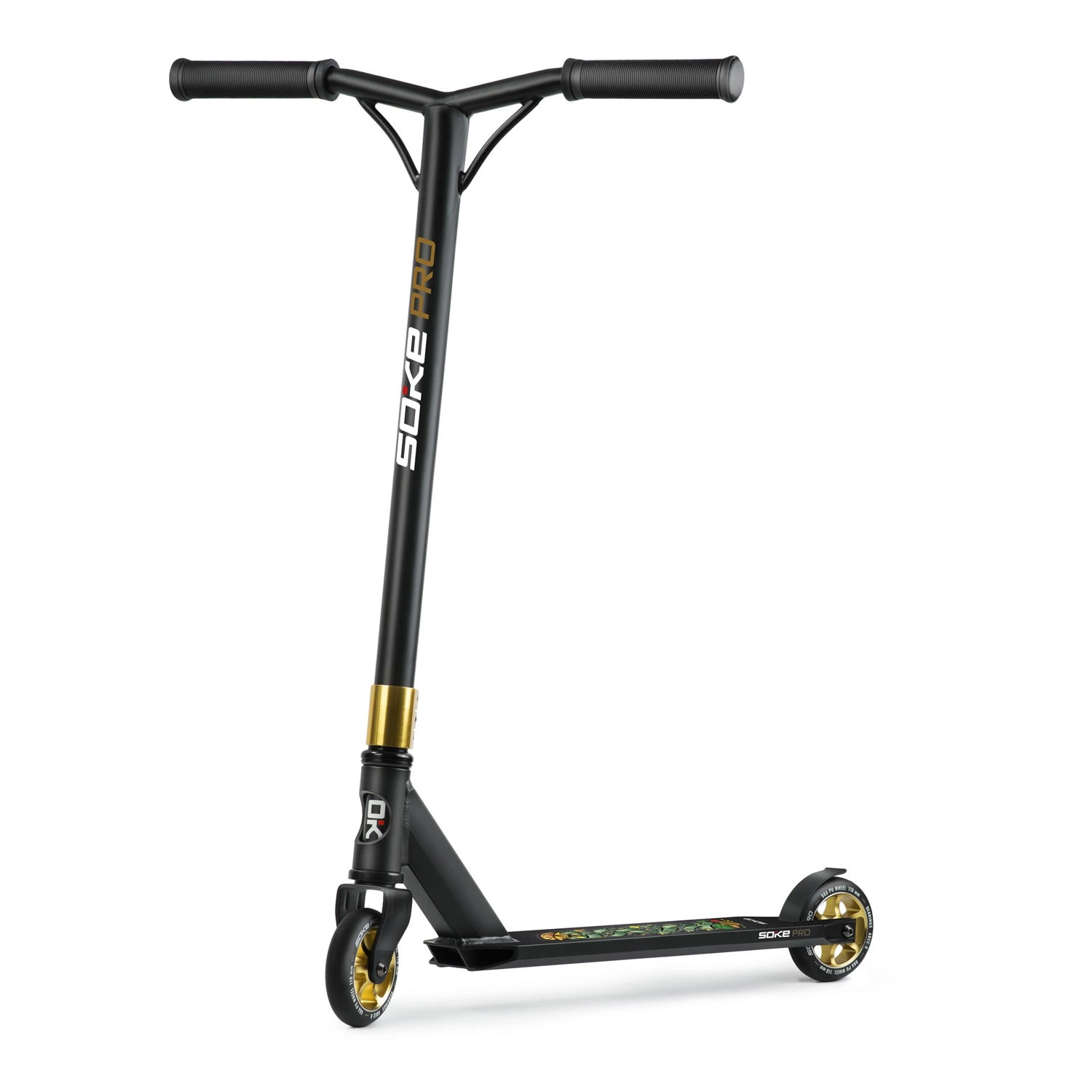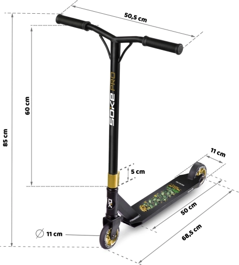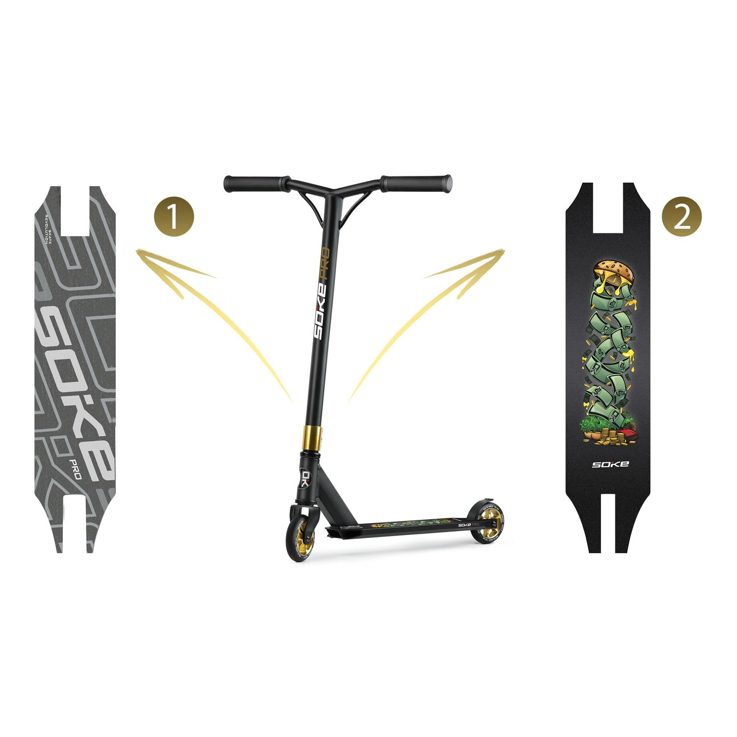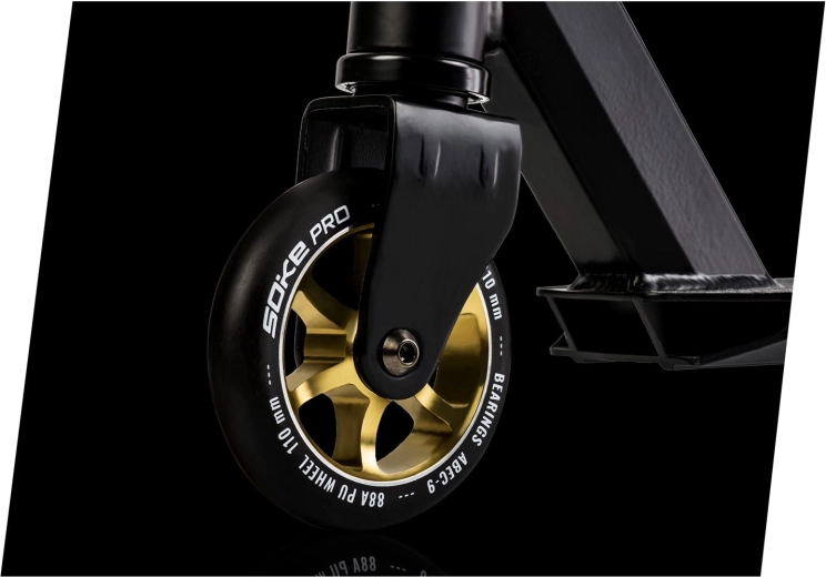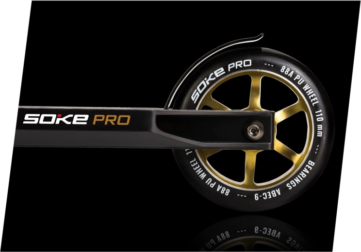 Zoek je een step die intensieve training en veeleisende tricks aankan? De Soke Pro Gold combineert een uitstekende prijs-kwaliteitverhouding met door rijders beproefde componenten: ABEC-9 voor soepele snelheid, 110 × 24 mm PU 88A voor optimale grip en een stevig aluminium deck met peg-cut vorm voor grinds en whips. Stabiele Y/T-rijdbaar 50,5 cm met 145 mm TPR-handgrepen bieden comfort en controle.
