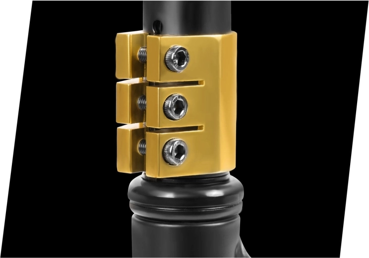 Het HIC-systeem met aluminium triple clamp en versterkte bouten houdt alles stevig bij elkaar voor precieze besturing en zekerheid bij landingen.