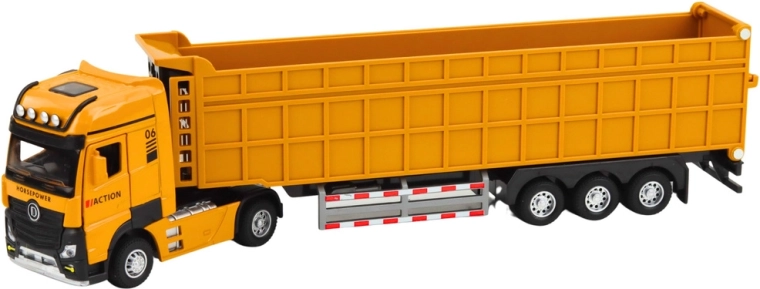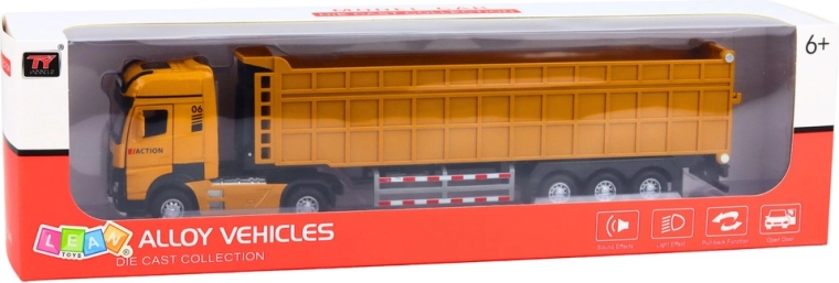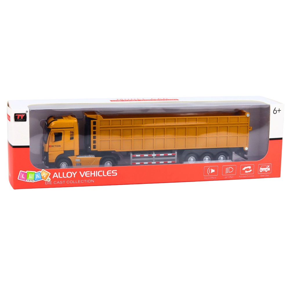 Realistische kieptruckcombinatie voor kinderen met een metalen cabine, rubberen banden en licht- en geluidseffecten. Dankzij de pull-back aandrijving rijdt hij zonder afstandsbediening of rijbatterijen, en de kipbare laadbak maakt eenvoudig laden en lossen mogelijk. Een geweldige keuze voor kleine liefhebbers van bouwmachines en creatieve spelletjes.