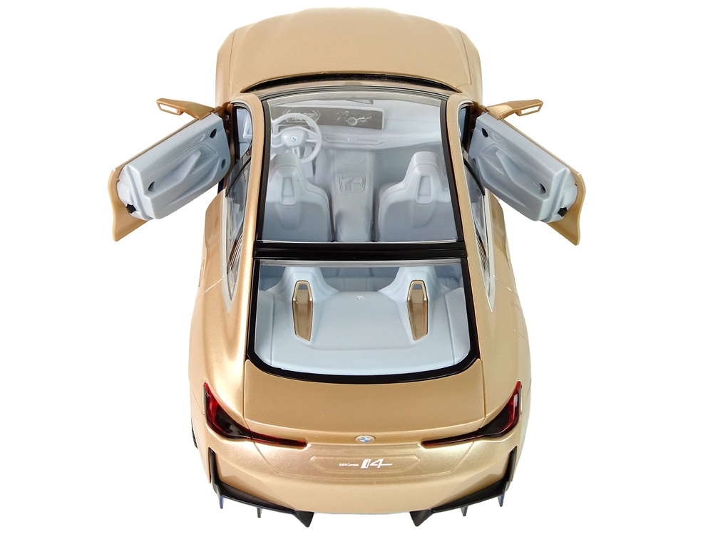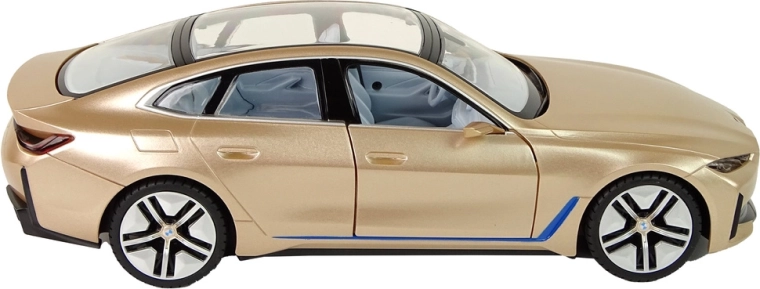 De gedetailleerde carrosserie van de BMW i4 met panoramadak, precieze lijnen en glanzende gouden lak in schaal 1:14 ziet er geweldig uit op het circuit en in de vitrine.