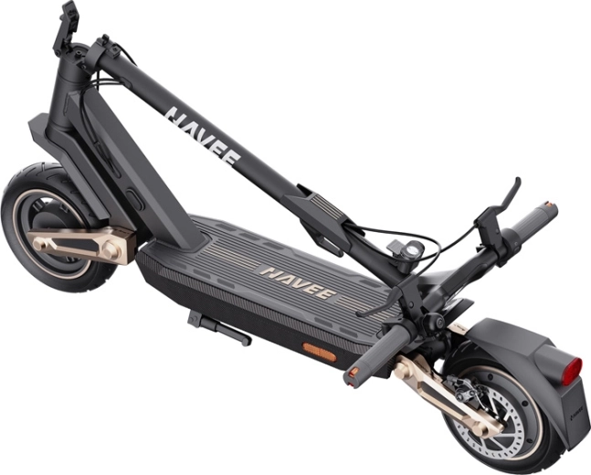Het doordachte design wordt aangevuld met 10" tubeless banden met gel-laag die bestand zijn tegen lekrijden (tot 4 mm), ergonomische handvatten met een hoek van 5° voor een natuurlijke grip, een breder dek en meer bodemvrijheid voor eenvoudig over oneffenheden rijden. De NAVEE-app biedt Apple Find My, automatische ontgrendeling via nabijheid, een elektronische vergrendeling, ritoverzicht, instelling van regeneratie en automatisch inschakelende verlichting bij schemering.