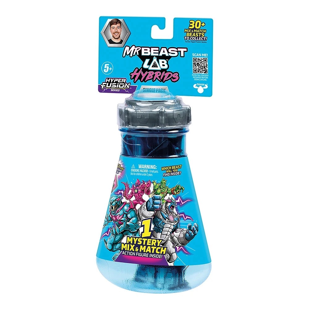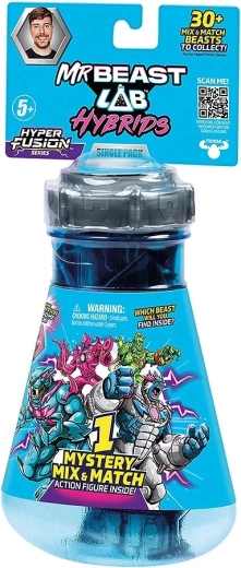 Betreed de waanzinnig creatieve wereld van MRBEAST Lab Hybrids Hyper Fusion. Elke Mystery Pack verbergt onderdelen van een van de 10 beesten, die vrij onderling uit te wisselen zijn. Dankzij het mix & match-systeem pas je je figuur eenvoudig aan en elke unboxing brengt een nieuwe verrassing – misschien zelfs de legendarische limited 1/1000.