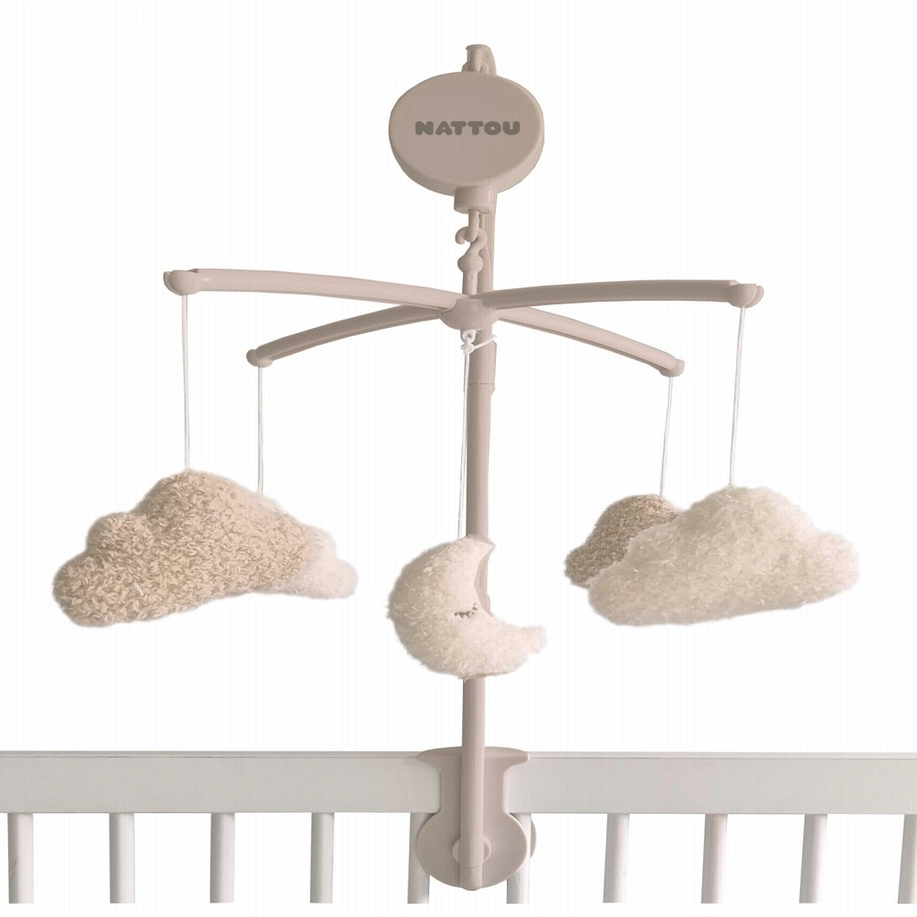 De NATTOU Teddy muziekmobiel met maantje en wolkjes creëert een rustige omgeving om in slaap te vallen en te ontspannen. De zachte melodie “Le-La-Lu” en de vloeiende beweging van de pluchen figuurtjes trekken de aandacht van je kindje, ondersteunen de zintuiglijke ontwikkeling en zorgen voor kalmte voor het slapengaan. Het elegante design past perfect in iedere kinderkamer.