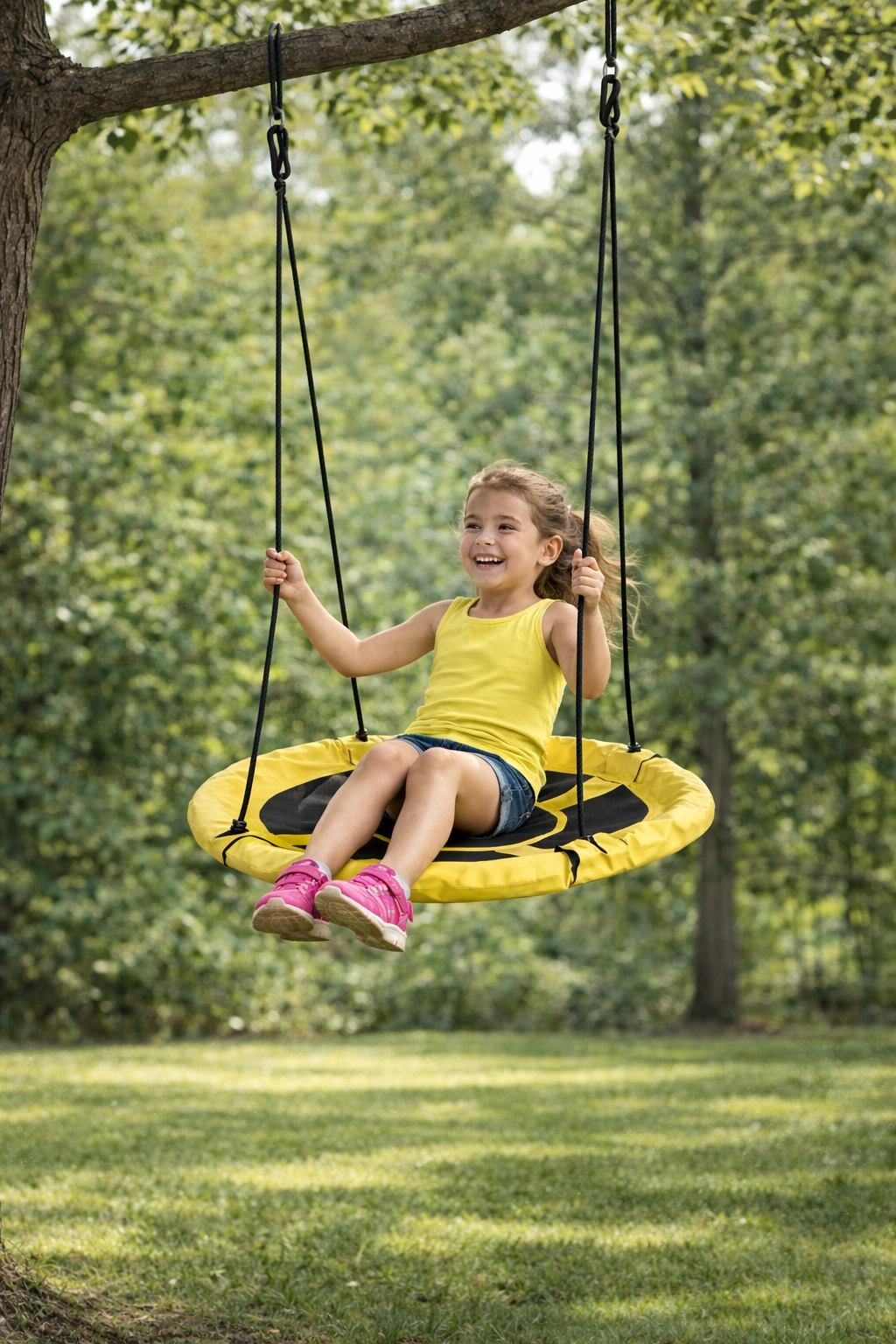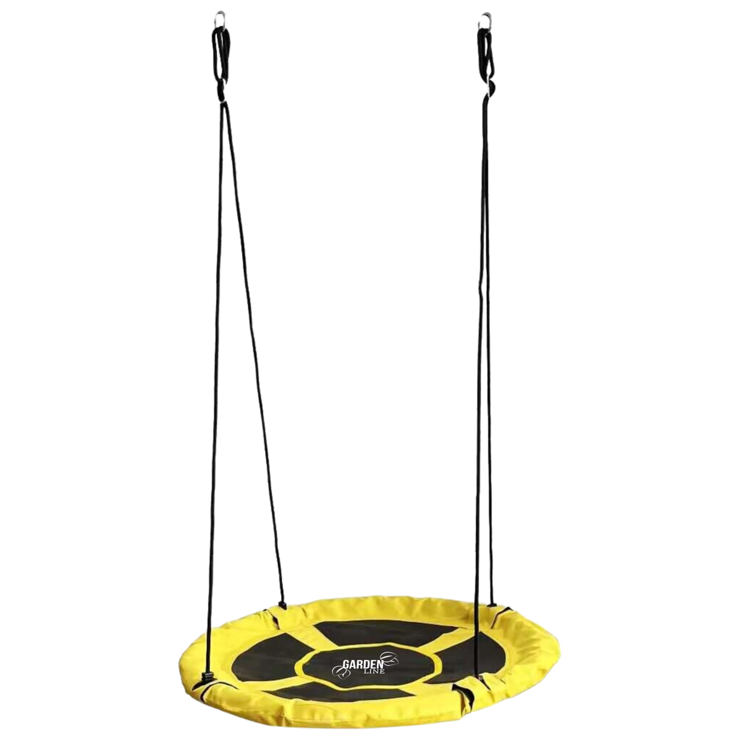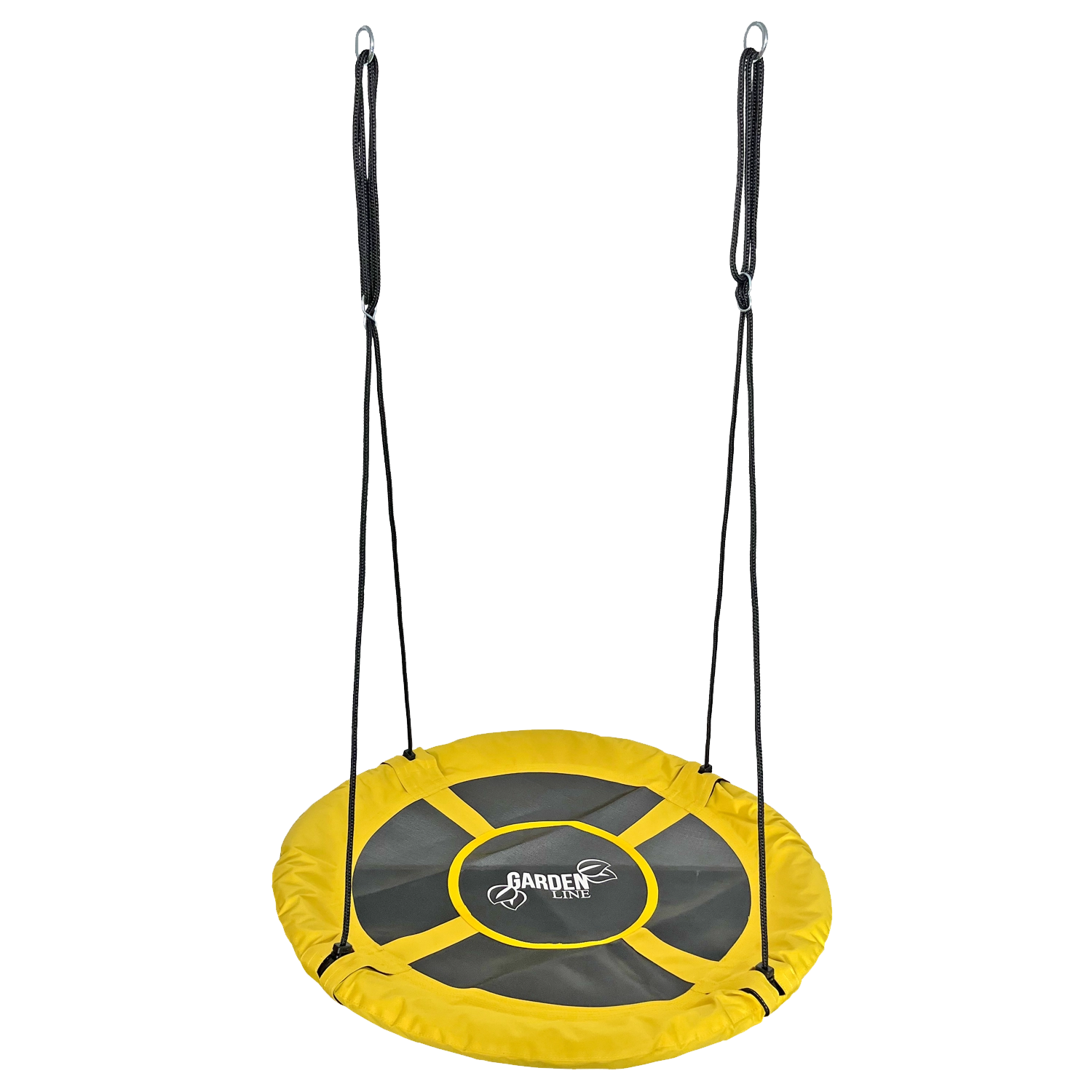 De gele nestschommel fleurt direct elke tuin of erf op. De brede, comfortabele zitting met slijtvaste afwerking en zachte rand hangt stabiel aan vier touwen, zodat kinderen veilig kunnen schommelen zittend of liggend. De diameter van 100 cm biedt voldoende ruimte voor één of meerdere kinderen.