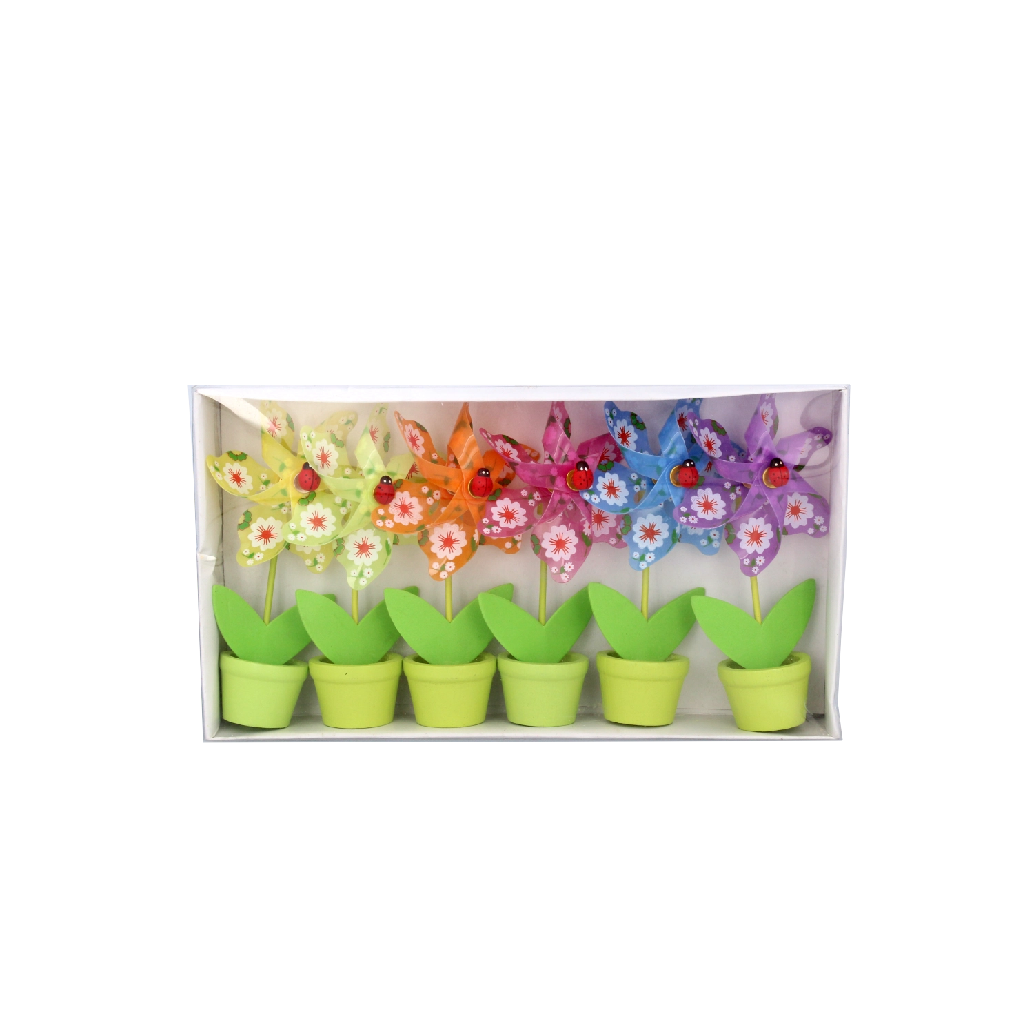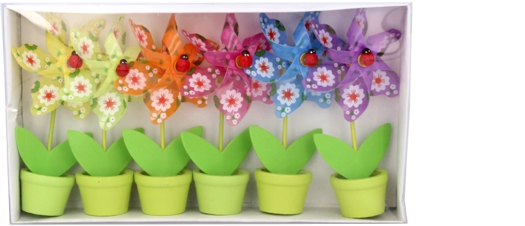 Elk windmolentje heeft een speels bloemmotief met een klein lieveheersbeestje en is verkrijgbaar in zes heldere kleurvarianten die elke ruimte opvrolijken.