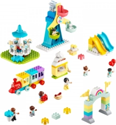 De set bevat zeven DUPLO-figuren, waaronder twee vrouwen, een man en vier kinderen. Kleurrijke elementen zoals veranderende regenbooglichten zorgen voor een realistische sfeer van een echt pretpark.