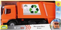 De oranje Mercedes‑Benz Arocs vuilniswagen van Lena biedt kinderen realistisch speelplezier rond afvalscheiding. Voorzien van stevige metalen wielassen (6 mm), duurzaam plastic, een beveiliging tegen ongewenst kiepen en twee vuilnisbakken voor extra plezier en leren.
