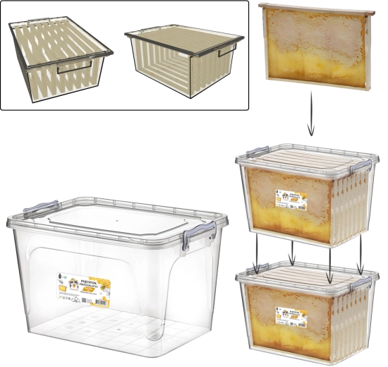 Praktische en duurzame opbergbox van 30 l voor het veilig bewaren van bijenkastramen. Dankzij speciale nokken raken de ramen de wanden niet, het goed sluitende deksel beschermt tegen ongedierte en de transparante uitvoering vergemakkelijkt de controle van de inhoud. De box is stapelbaar, heeft zijhandgrepen voor eenvoudig dragen en biedt plaats aan tot 8 ramen (Wielkopolska) of 16 ramen 1/2.
