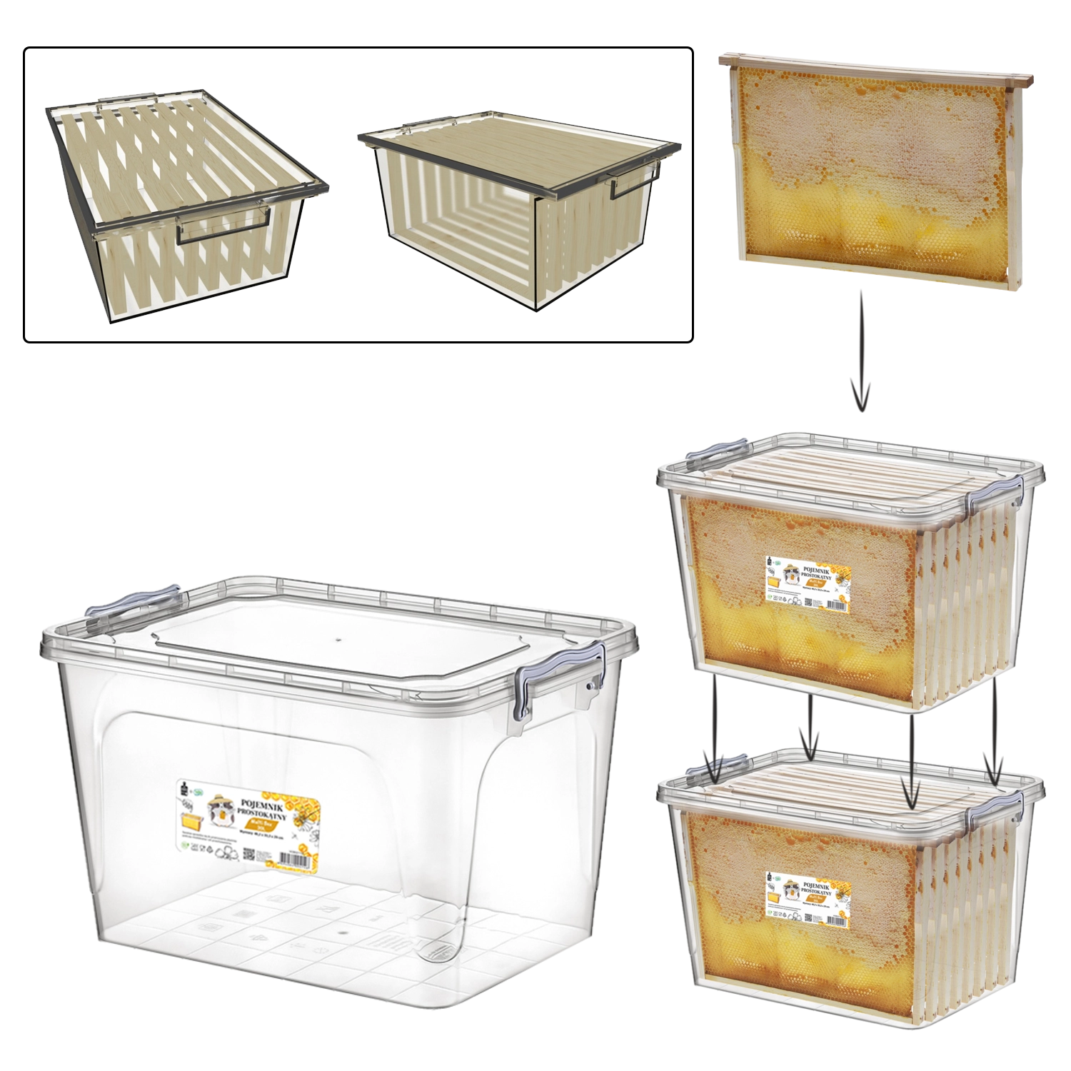De rechthoekige Multi box 30 l is ontworpen voor gebruik het hele jaar door, inclusief in de winter. Speciale binnenlijsten houden de raten zo dat ze de wanden niet raken en schoon en onbeschadigd blijven. Het goed sluitende deksel voorkomt effectief het binnendringen van de wasmot en kleine knaagdieren, terwijl de transparante wanden snelle visuele controle zonder openen mogelijk maken.