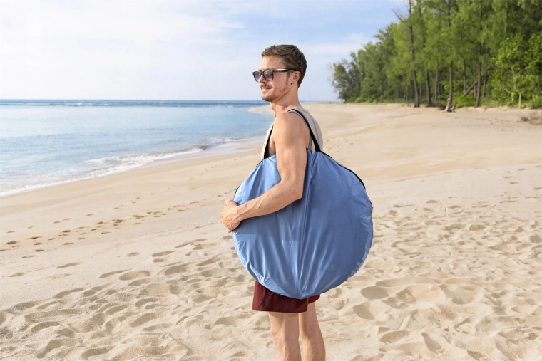 Met een gewicht van slechts 1,1 kg en een praktische draagtas is de tent een ideale reisgenoot. Je zult ook de binnenzak voor kleine spullen waarderen, het snelle inpakken in het compacte ronde etui en de betrouwbare bescherming tegen zon en wind.