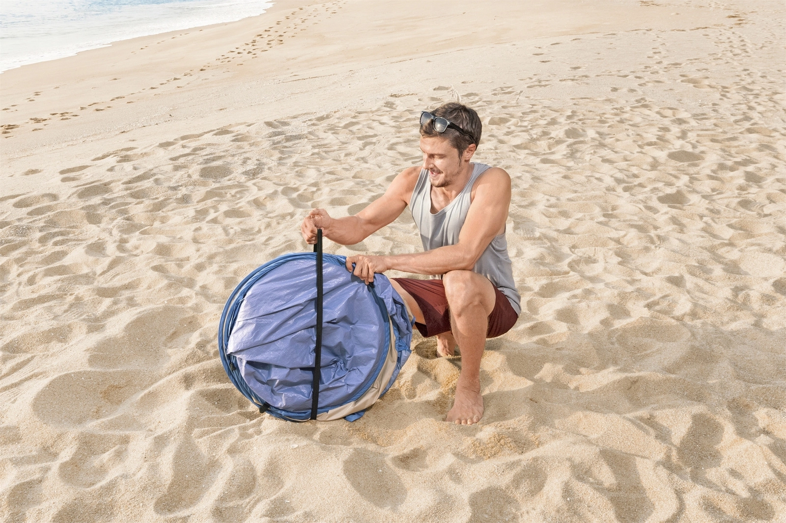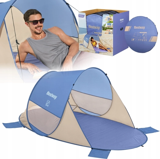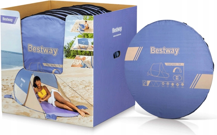 Geniet van comfort op het strand, bij het meer of in de tuin. De BESTWAY Beach Quick 2 strandshelter combineert ultrasnel opzetten, een laag gewicht en een stabiele glasvezelconstructie. De brede ingang en meshramen bieden uitstekende luchtcirculatie, terwijl de geïntegreerde bodem een schone en comfortabele plek creëert om te relaxen.