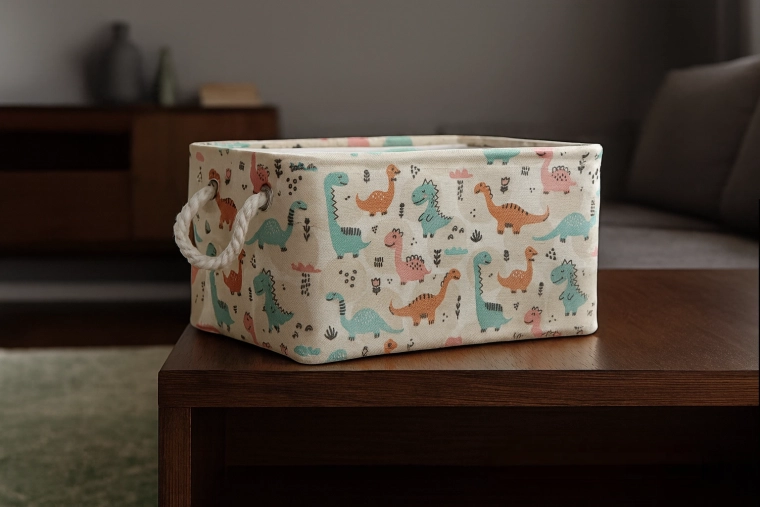 De rechthoekige opbergmand met een vrolijk dinosaurusmotief combineert functionaliteit met een speels design. Dankzij de compacte afmetingen van 26 × 36 × 20 cm wordt de ruimte in de kinderkamer, slaapkamer of woonkamer efficiënt benut. De slijtvaste stof behoudt zijn vorm, is gemakkelijk schoon te maken en kan dagelijks gebruik aan.