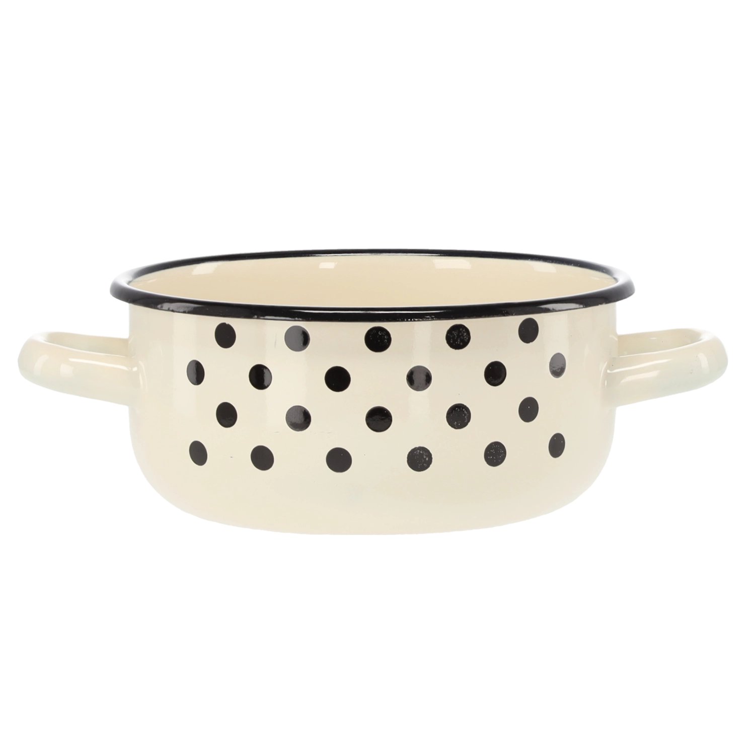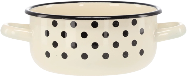 Praktische geglazuurde steelpan met een inhoud van 1,5 l en een diameter van 16 cm, in elegante witte kleur met decoratieve stippen. Dankzij de twee handgrepen is hij gemakkelijk te hanteren; ideaal voor dagelijks koken, opwarmen en serveren. Duurzame emaillelaag, stijlvol design en eenvoudig onderhoud voor kookplezier, elke dag.