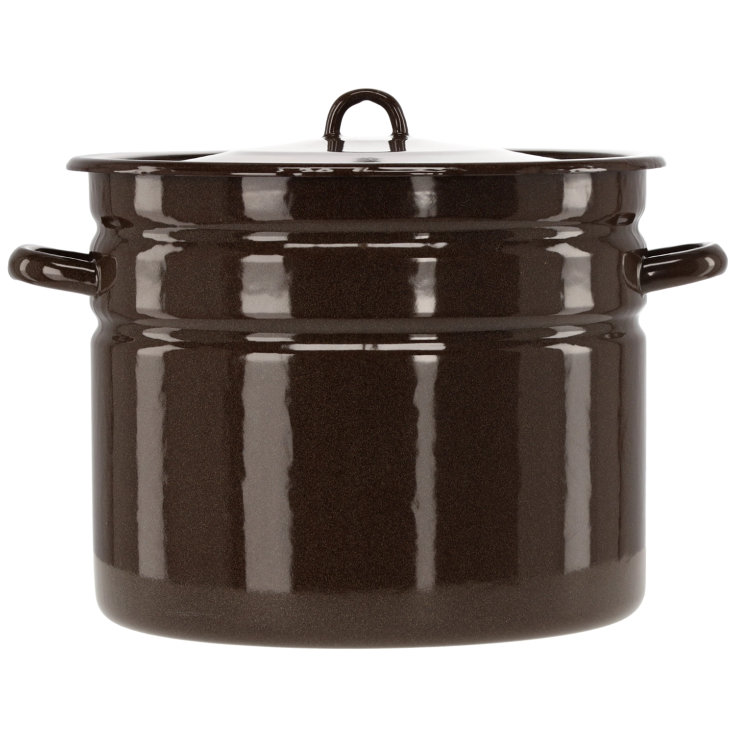 Praktische en duurzame geëmailleerde pan met een inhoud van 20 l en een diameter van 32 cm in een elegante bruine kleur, inclusief deksel. Ideaal voor koken in grotere hoeveelheden, wecken en dagelijks gebruik – het geëmailleerde oppervlak is hygiënisch, gemakkelijk te reinigen en slijtvast tegen krassen.