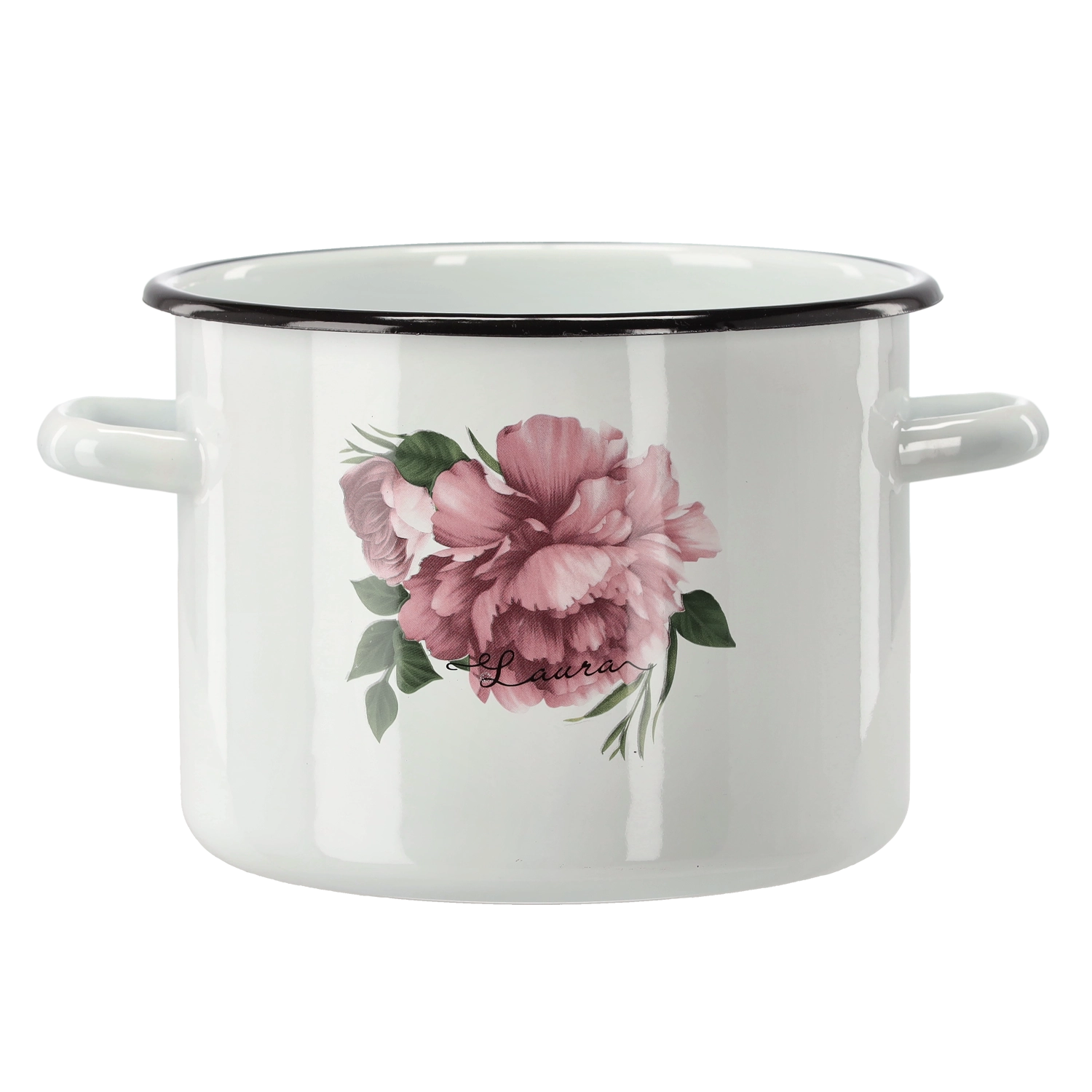 Deze hoogwaardige geëmailleerde pan is een uitstekende keuze voor de dagelijkse bereiding van soepen, sauzen en bijgerechten. Het witte oppervlak met het subtiele Pioen Laura-patroon geeft je keuken een frisse en elegante uitstraling, terwijl het duurzame email een lange levensduur en hygiënisch gebruik garandeert.