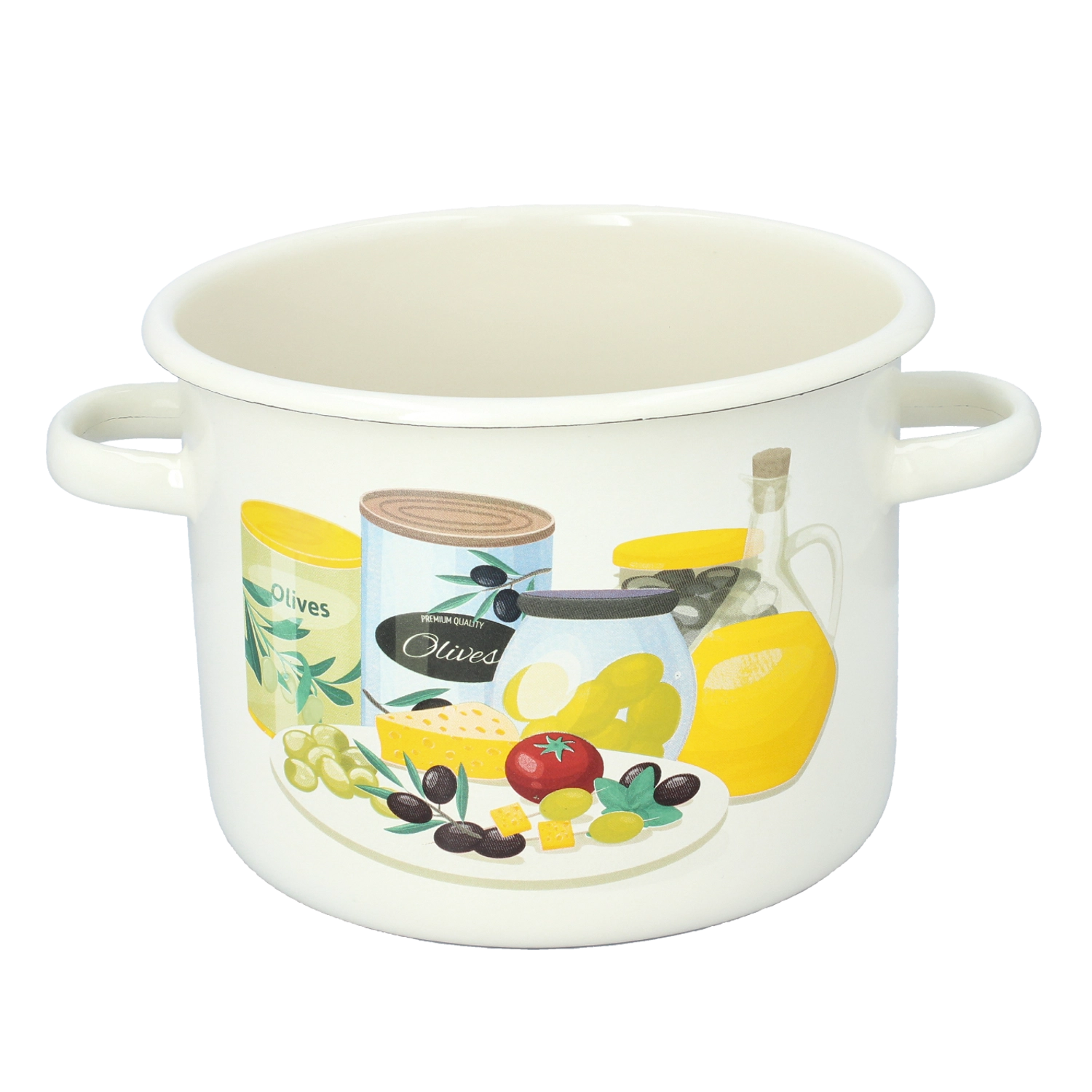 Praktische geglazuurde pan met een inhoud van 4,5 l en een diameter van 20 cm in elegante crèmekleur met een decoratief olijvenmotief. Uitstekend in duurzaamheid, eenvoudig onderhoud en ideaal voor het bereiden van grotere porties van alledaagse gerechten.