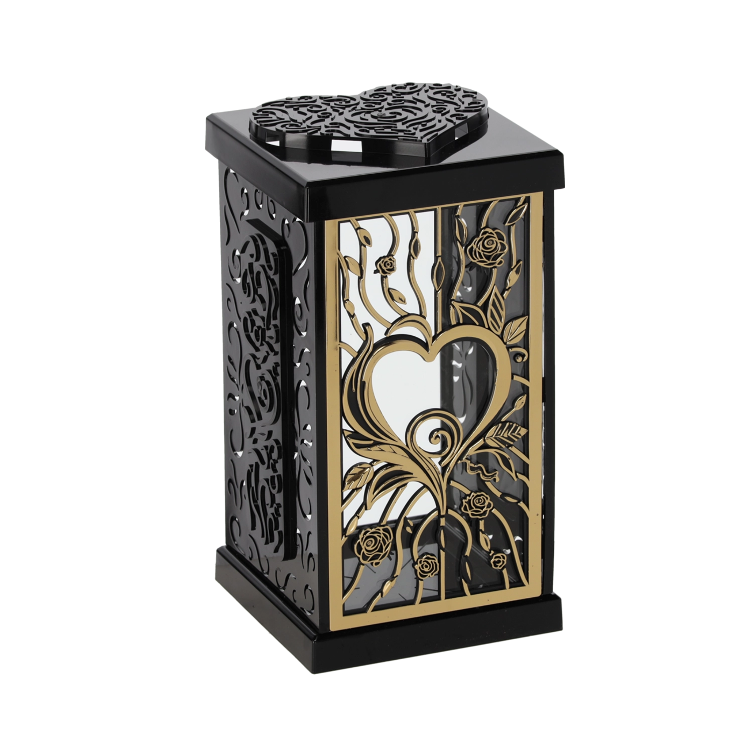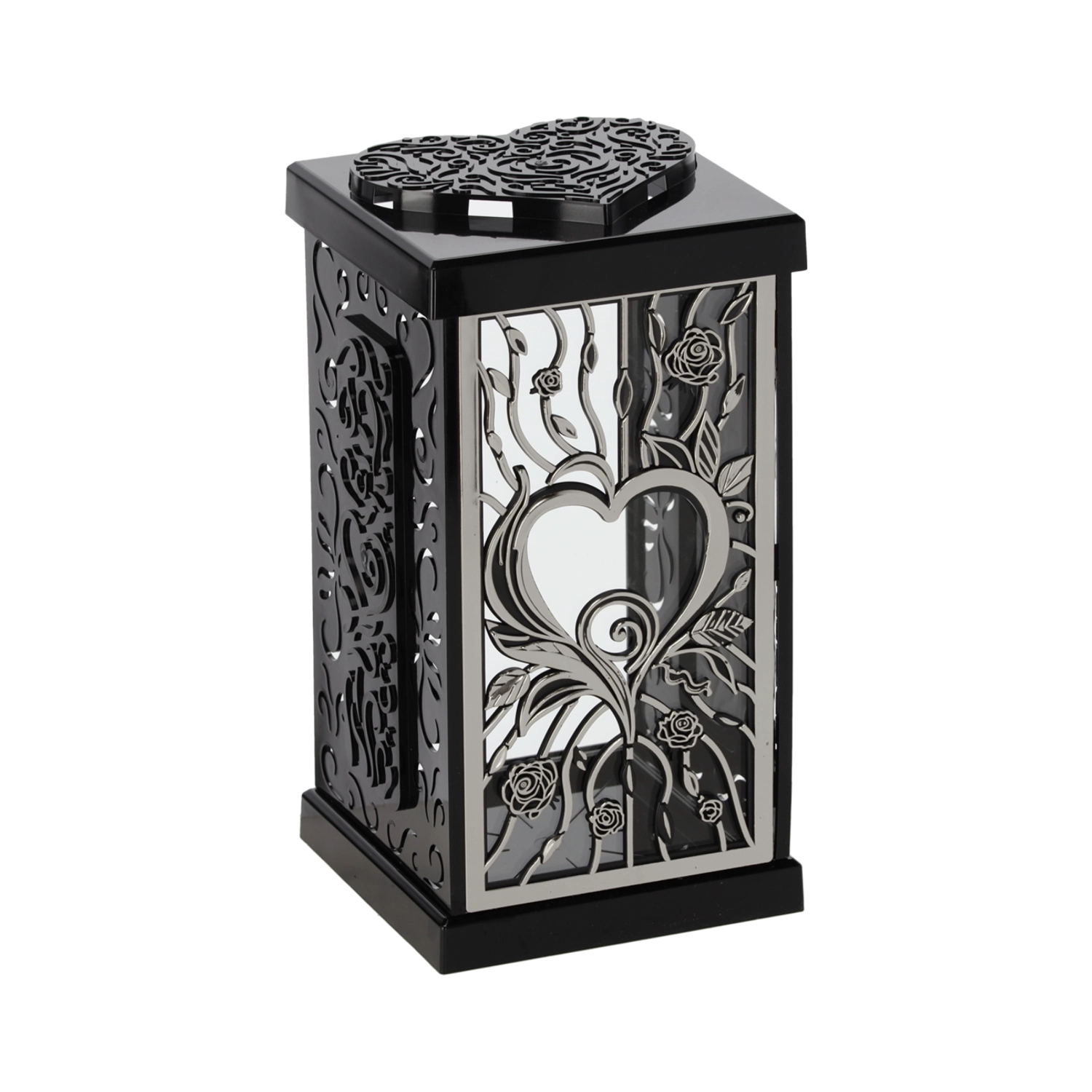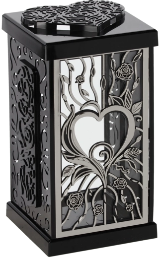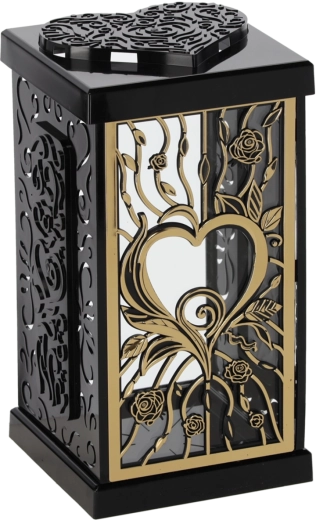Deze stijlvolle lantaarn met een groot rozenmotief geeft elke herdenkingsplek een waardige en elegante sfeer. Dankzij het tijdloze design in zwart‑zilver of zwart‑goud past hij mooi bij verschillende soorten grafmonumenten en decoraties.