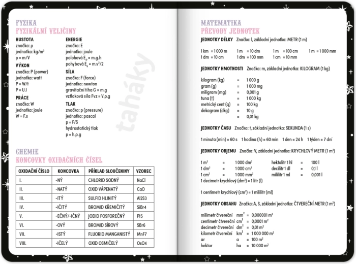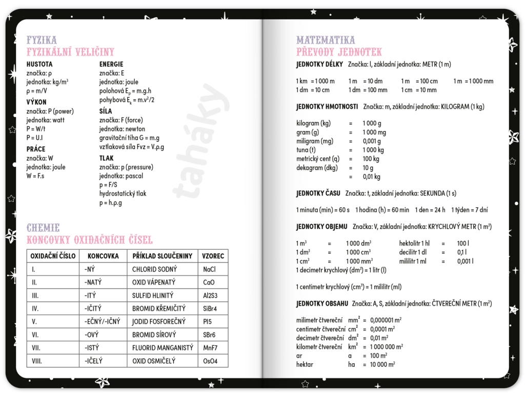 De agenda bevat slimme hulpmiddelen die tijd besparen bij het studeren en plannen. Je vindt er spiekbriefjes voor wiskunde, natuurkunde, scheikunde en Engels, lesroosters voor snelle oriëntatie en een overzicht van vakantiedata. De duidelijke indeling van dagen en weken helpt je toetsen, opdrachten en vrije tijd onder controle te houden.