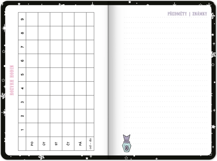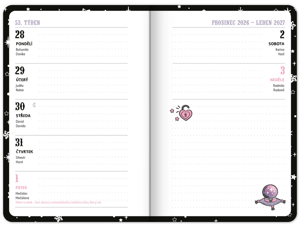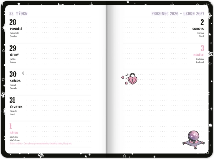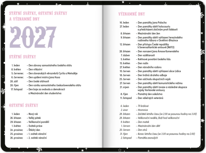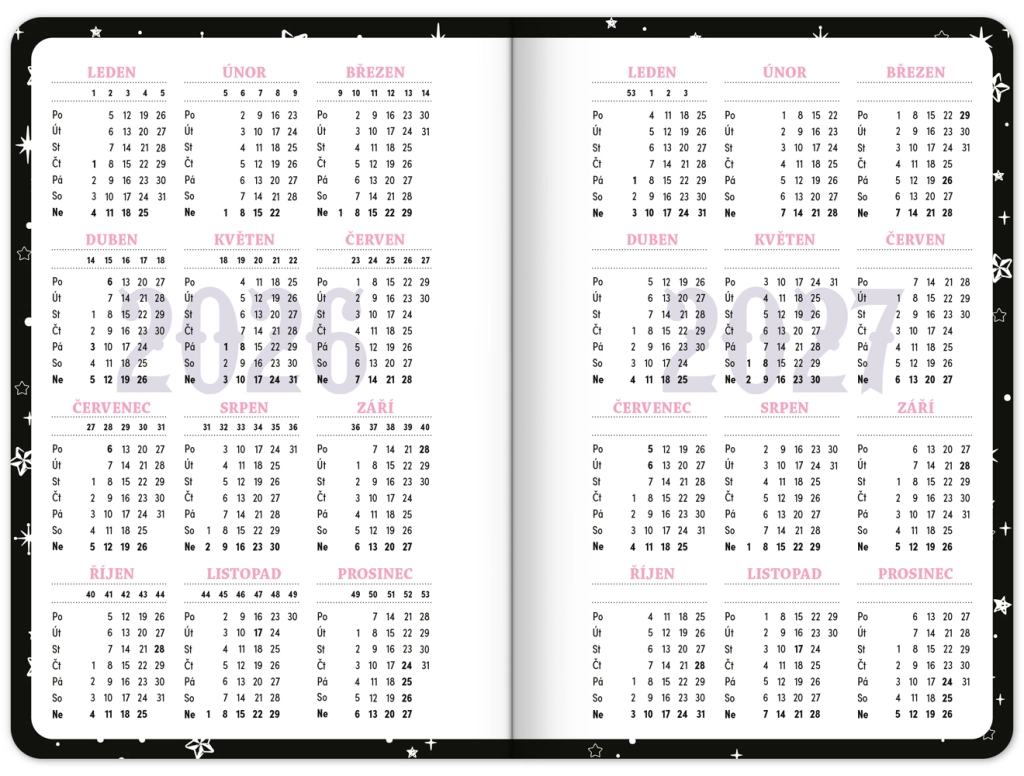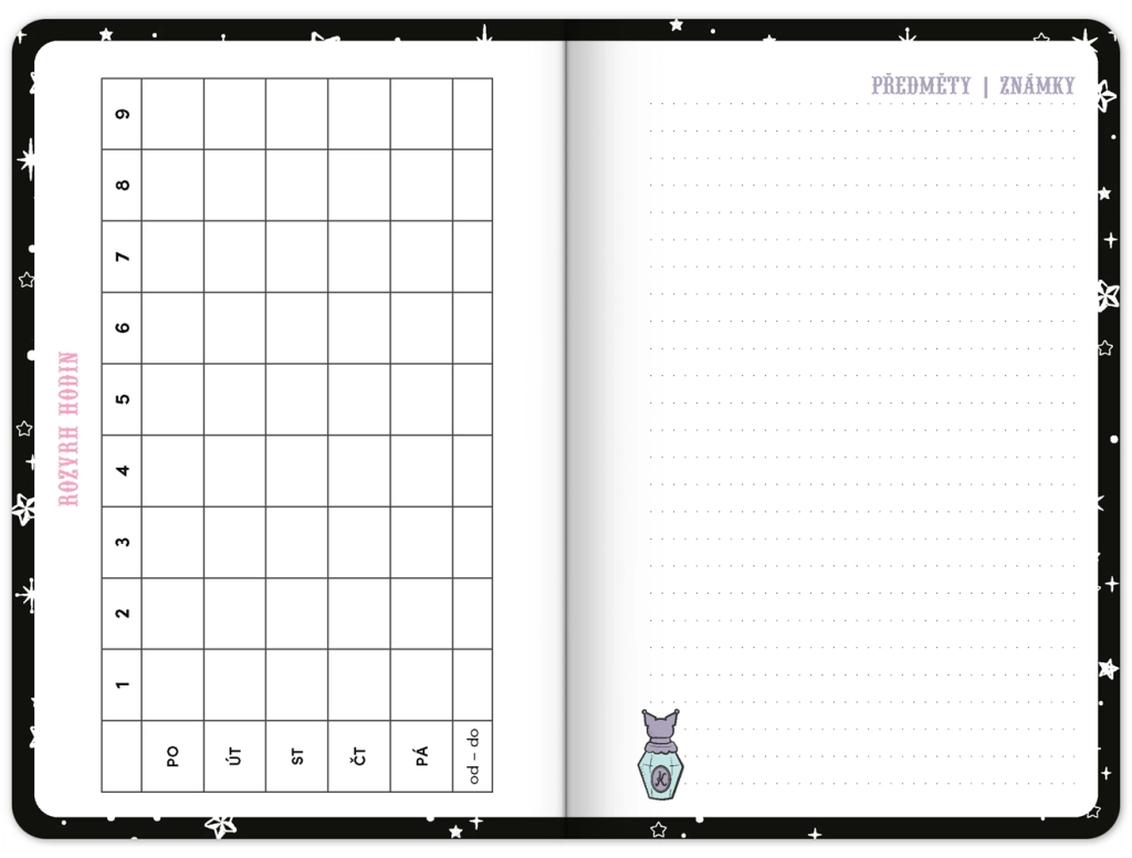 Stijlvolle studentenagenda met het motief van KUROMI voor scholieren en studenten voor de periode september 2026 – december 2027. Biedt praktische spiekbriefjes voor wiskunde, natuurkunde, scheikunde en Engels, een overzicht van lesroosters en vakantiedata. Het compacte formaat 9,8 × 14,5 cm past in elke rugzak en handtas.