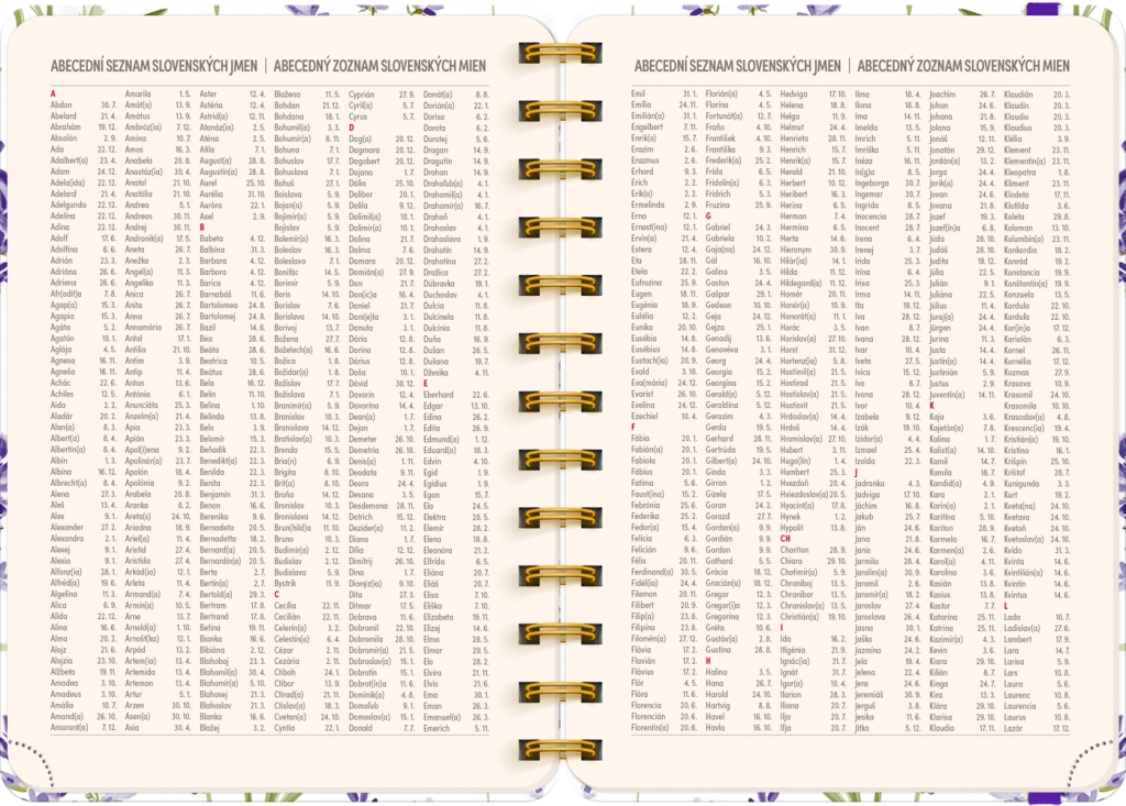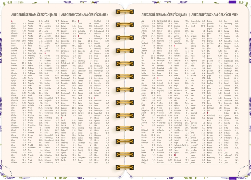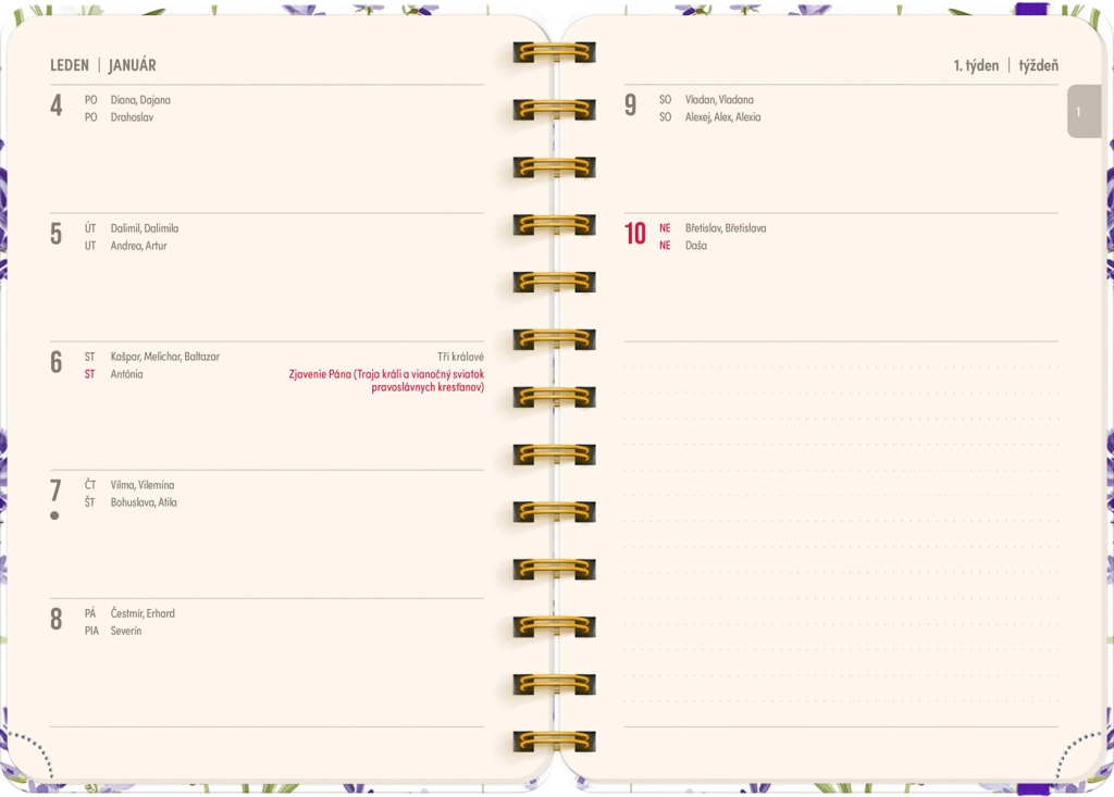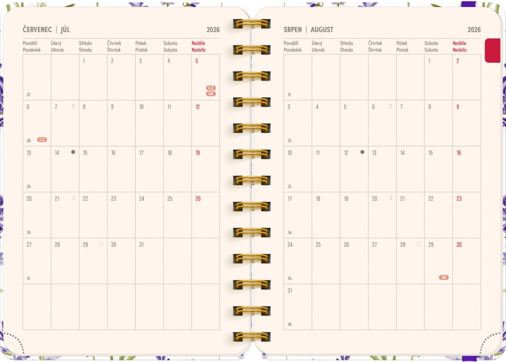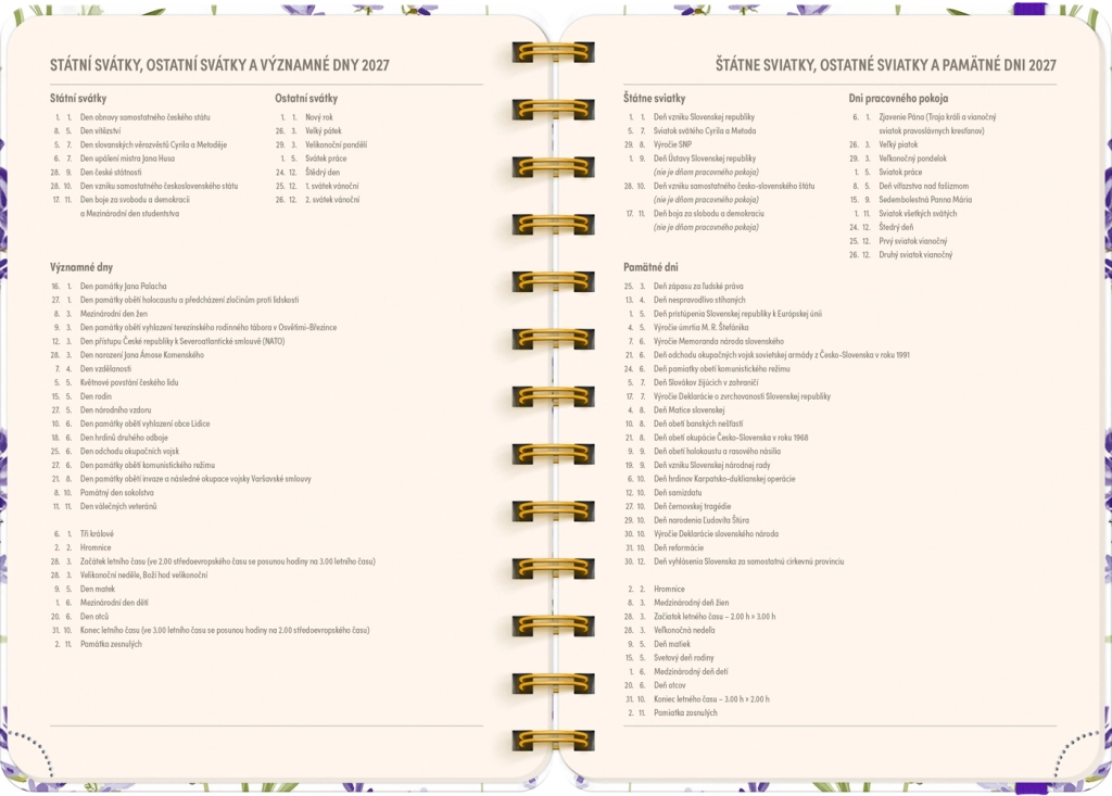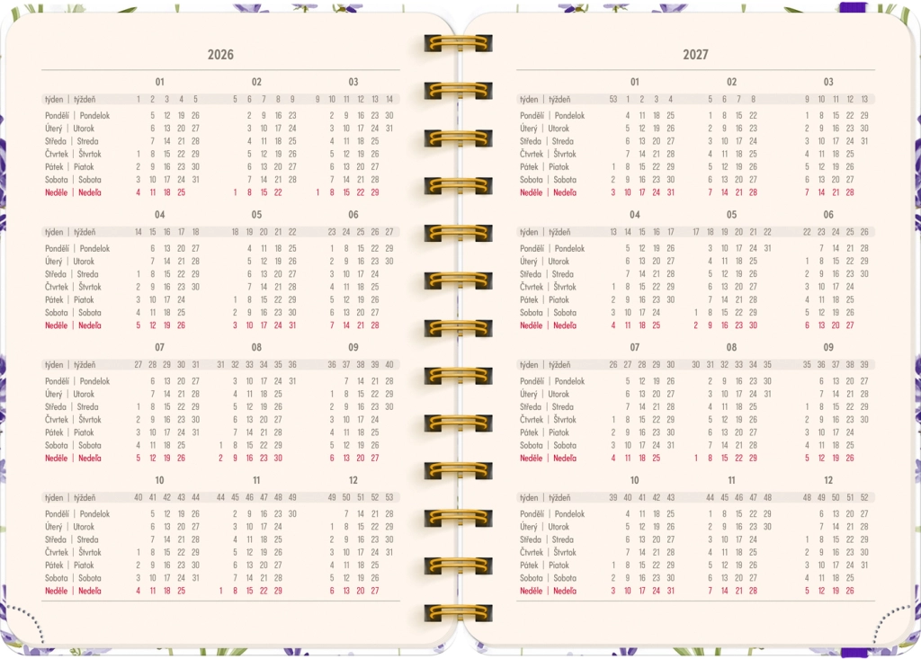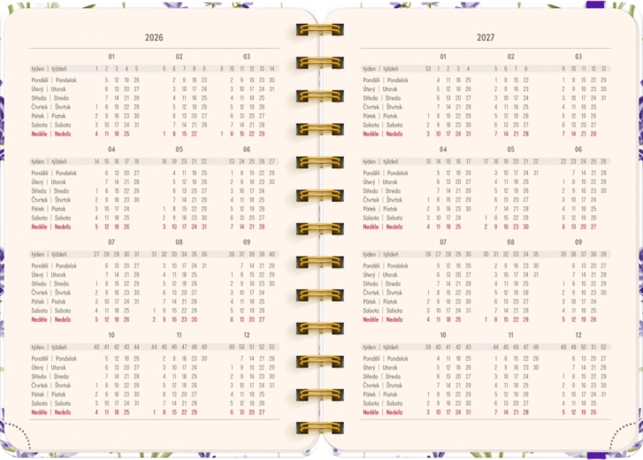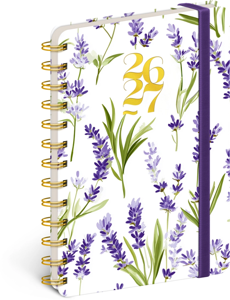 De elegante 18‑maandenagenda Petito met lavendelmotief combineert overzicht en stijl voor planning van juli 2026 tot en met december 2027. Biedt een wekelijks lijnenoverzicht met Tsjechische en Slowaakse namen en feestdagen, maandoverzichten voor 2026 en 2027 en voldoende notitieruimte in elke week.