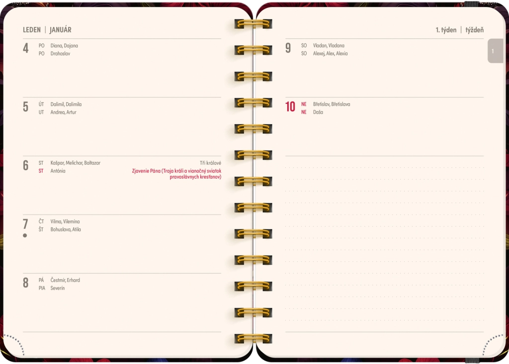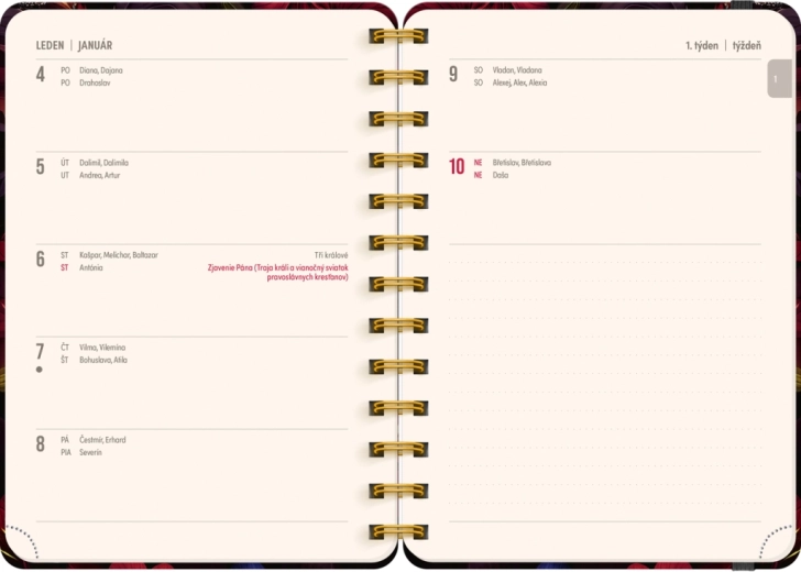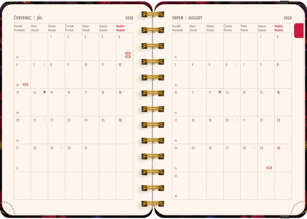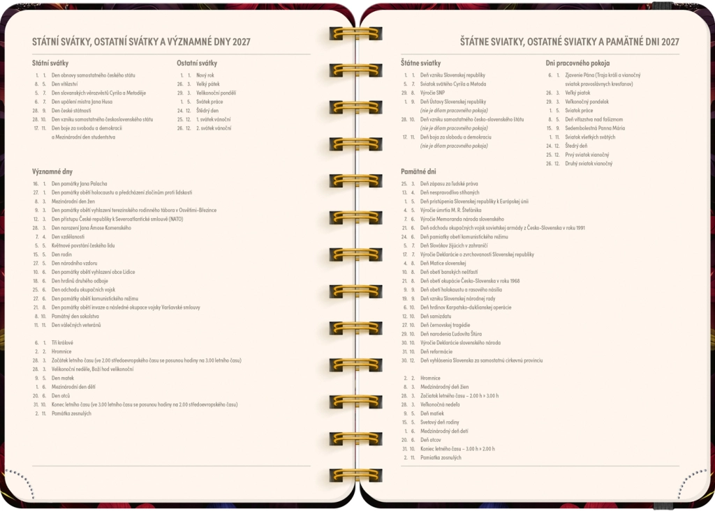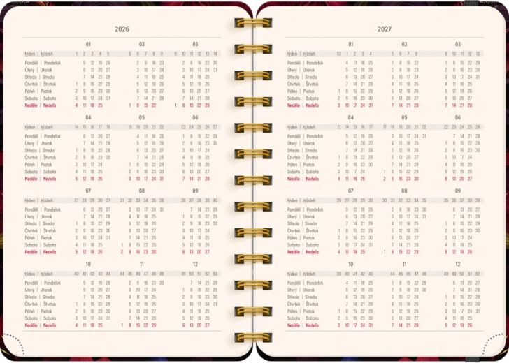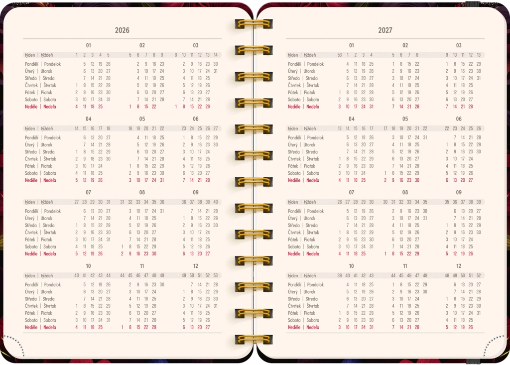 Elegante 18‑maanden agenda met motief van rode bloemen voor de periode 07/2026–12/2027. Voorzien van een praktisch Tsjechisch‑Slowaaks weekoverzicht met namen en naamdagen, overzichten van 2026 en 2027 en voldoende ruimte voor notities in elke week. Compact formaat 13 × 18 cm en spiraalbinding voor comfortabel schrijven thuis en onderweg.