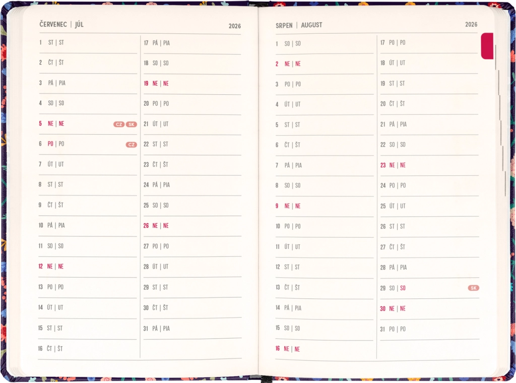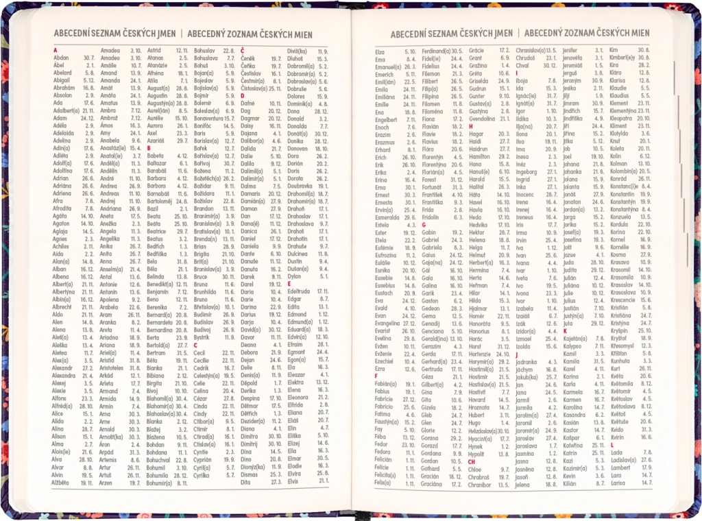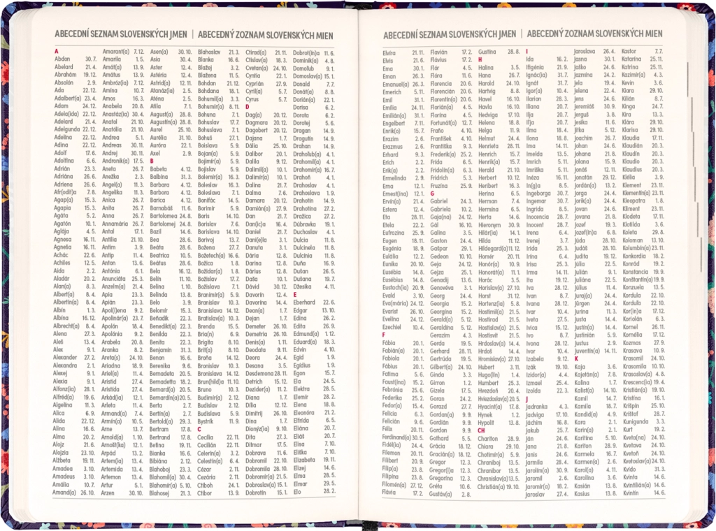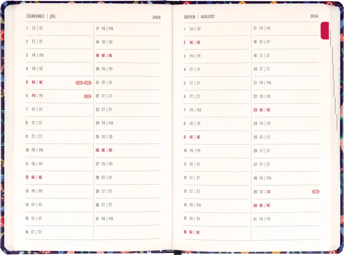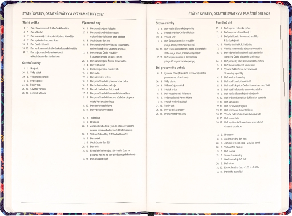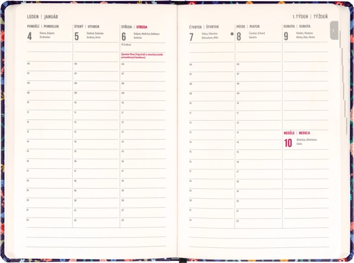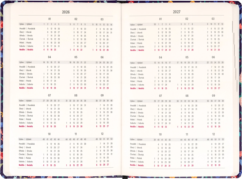 De stijlvolle Notique Petito Flora agenda combineert een praktische weekindeling in kolommen met een subtiel bloemendesign. Dankzij de overzichten voor 2026 en 2027 en de lijst met Tsjechische en Slowaakse namen hebt u feestdagen en planning altijd bij de hand.