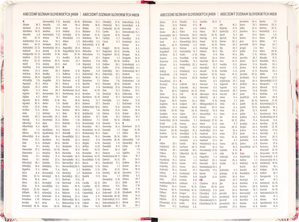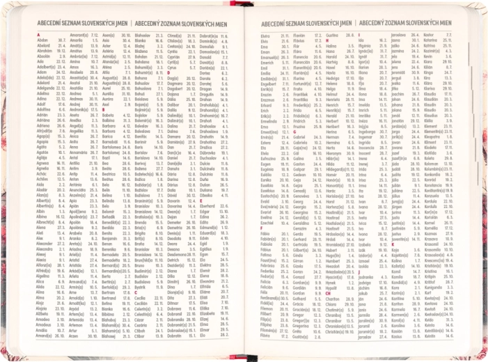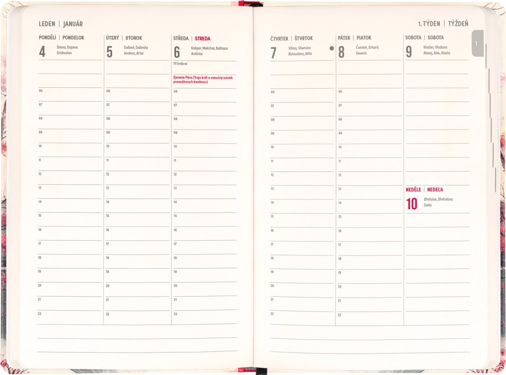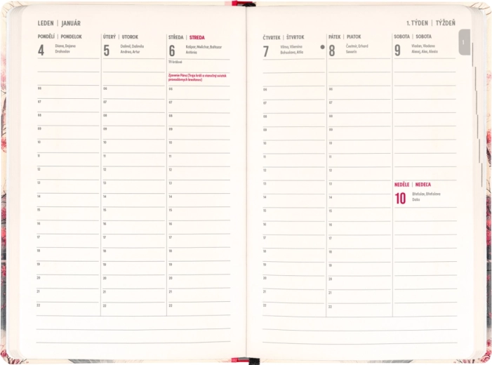 - wekelijkse kolomindeling, Tsjechisch‑Slowaaks met namen en feestdagen