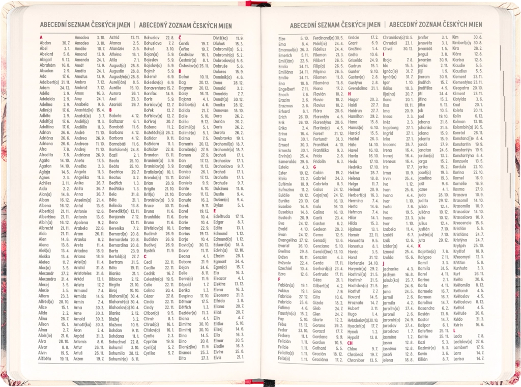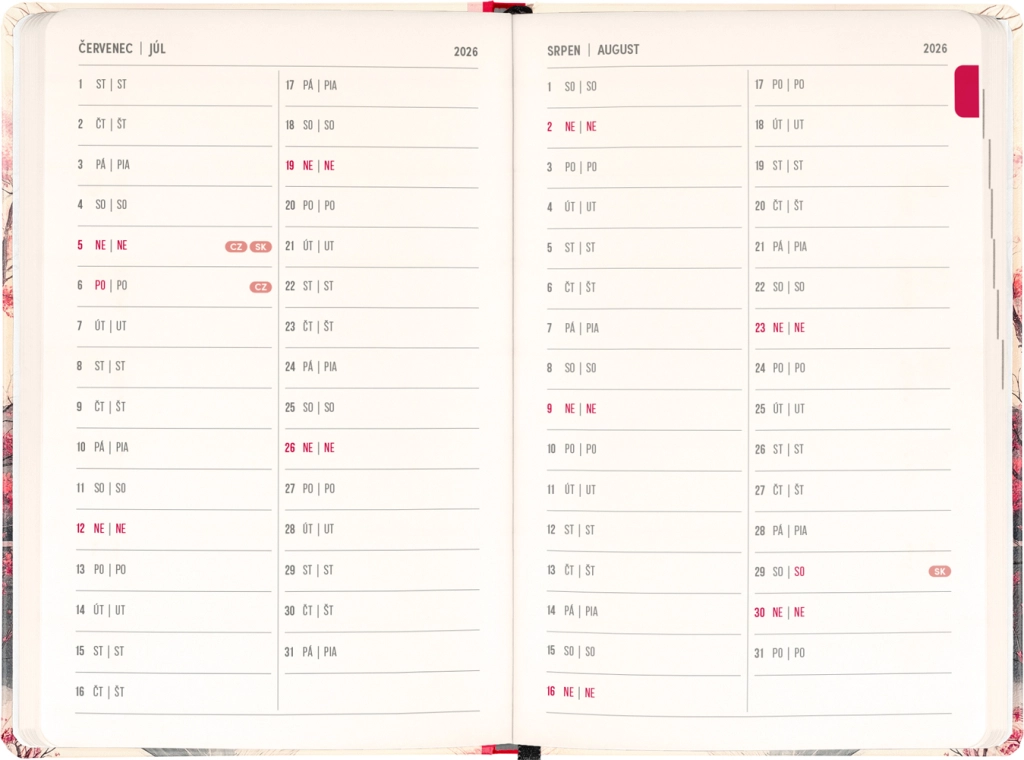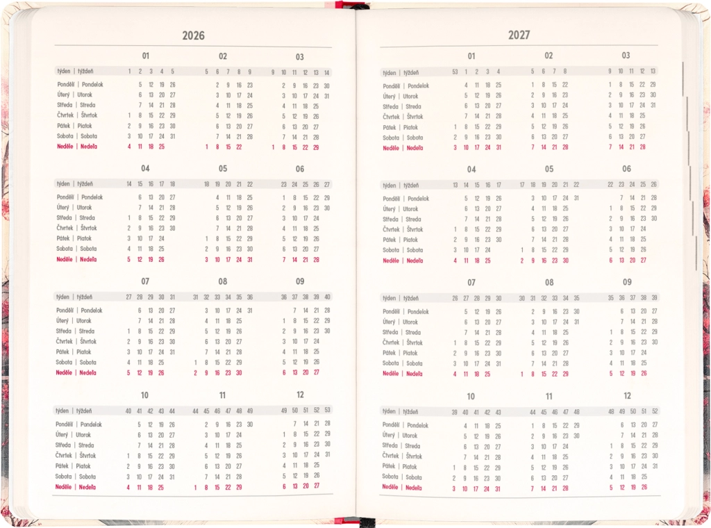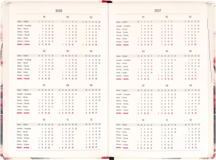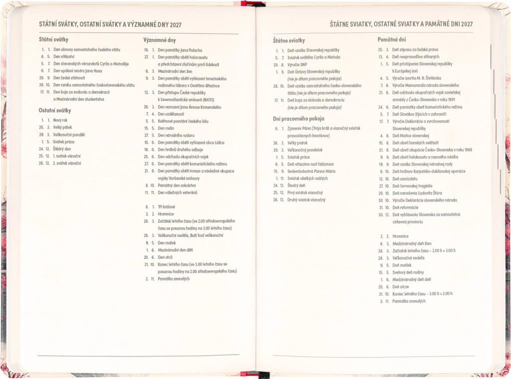 De agenda is er voor dagelijks plannen en bijzondere momenten: je vindt er jaaroverzichten 2026 en 2027, een lijst met Tsjechische en Slowaakse namen en herinneringen aan feestdagen. Duidelijke kolommen per dag maken het organiseren van werk, school en vrije tijd makkelijker.