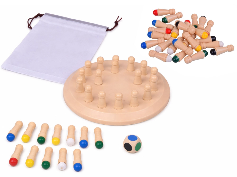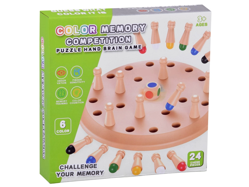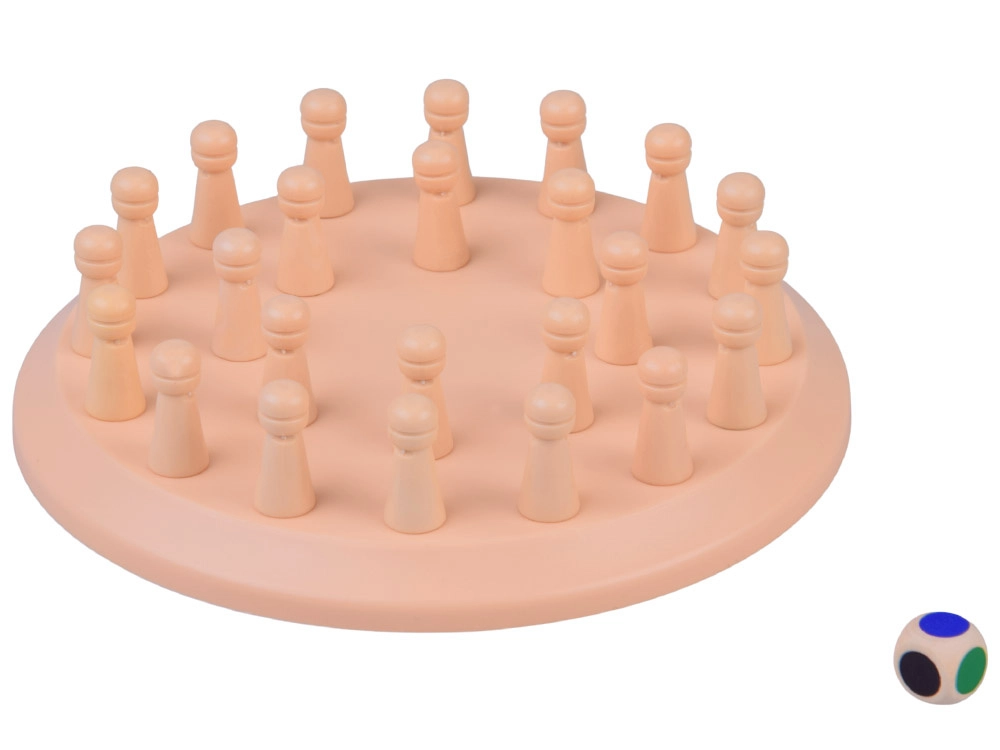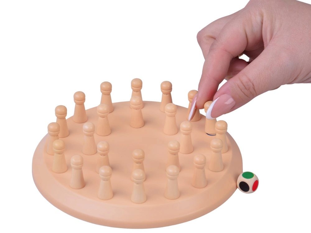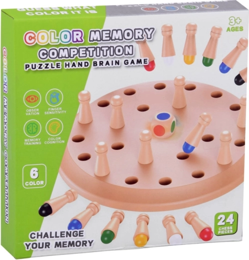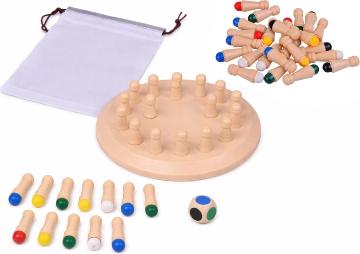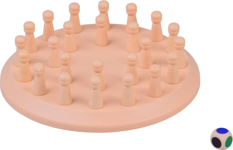 De ronde houten plaat met openingen en pinnetjes verbergt kleuren die spelers moeten onthouden. Na een worp met de gekleurde dobbelsteen proberen ze het pinnetje in de bijpassende kleur te vinden. Bij een juiste keuze krijg je het pinnetje, anders gaat het terug – dan is de volgende speler aan de beurt. Het spel is perfect voor het ontwikkelen van visueel geheugen, verbanden leggen en fijne motoriek.