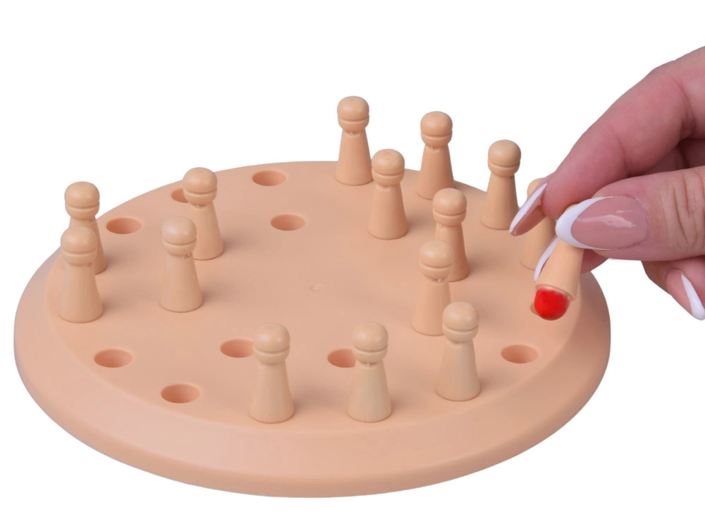 De gekleurde uiteinden van de pinnetjes, verborgen in de openingen, dwingen spelers om posities en kleuren te onthouden. Ideaal om cognitieve vaardigheden spelenderwijs te oefenen.