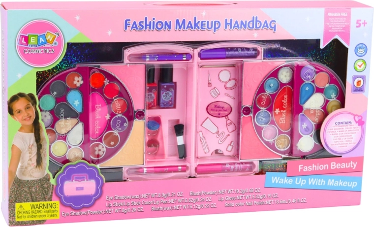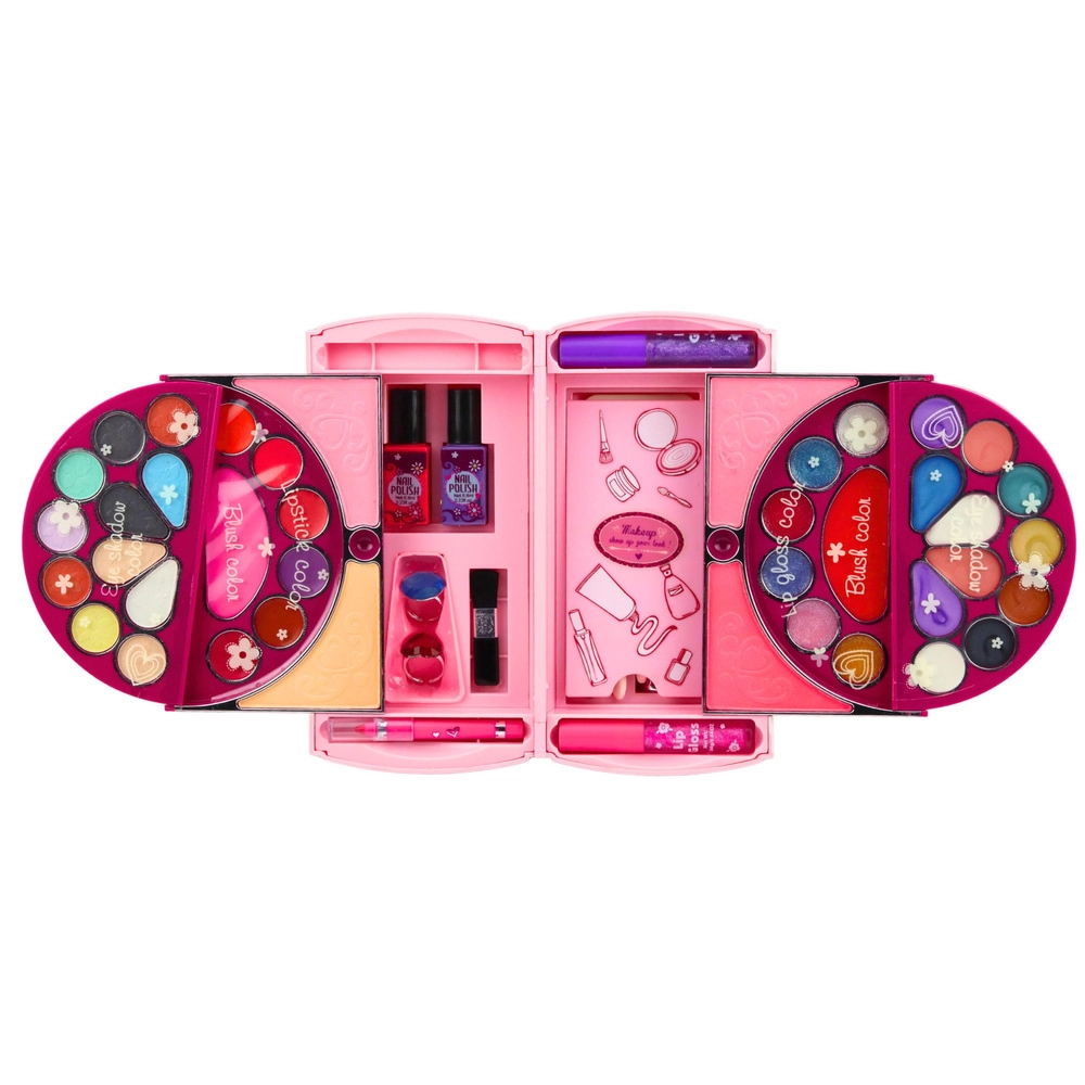 Grote opklapbare roze koffer voor kleine make-up liefhebsters met een complete set kindermake-up en nagelaccessoires. Na het openen verandert hij in een overzichtelijk palet met oogschaduws, blushes, glossen en lakjes, aangevuld met een veilig spiegeltje, applicators en sponsjes. De cosmetica is zacht voor de kinderhuid, makkelijk met water afwasbaar en geparfumeerd met een zoet-fruitige geur – ideaal voor creatief spel en de eerste stapjes in de beautywereld.