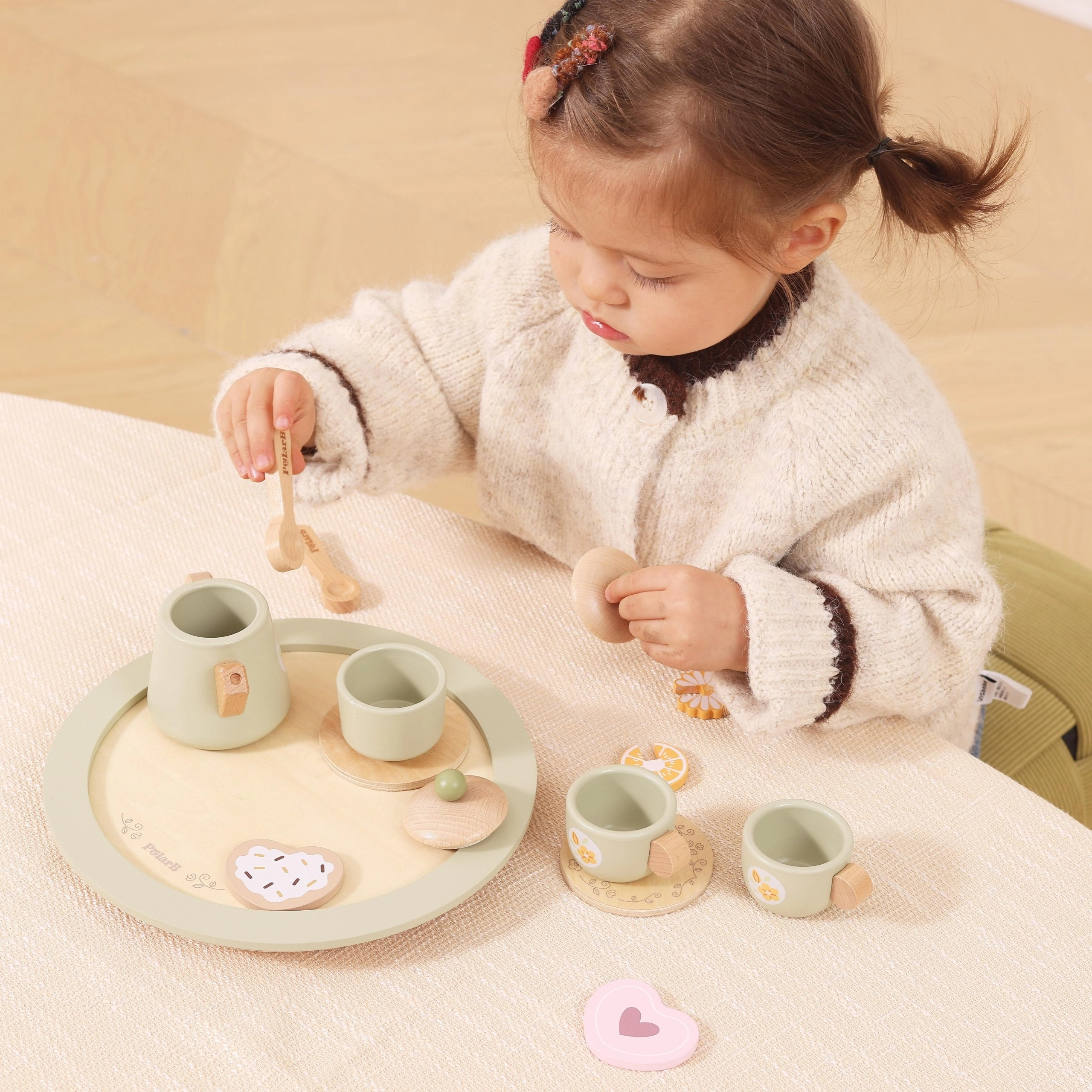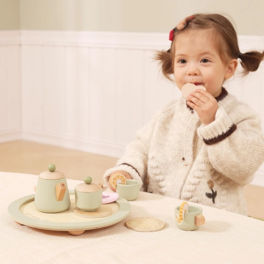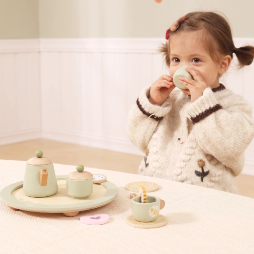 De complete uitrusting met theepot, kopjes, suikerpot, lepeltjes, toetjes en dienblad motiveert kinderen tot rollenspel, delen en het leren van goede manieren.