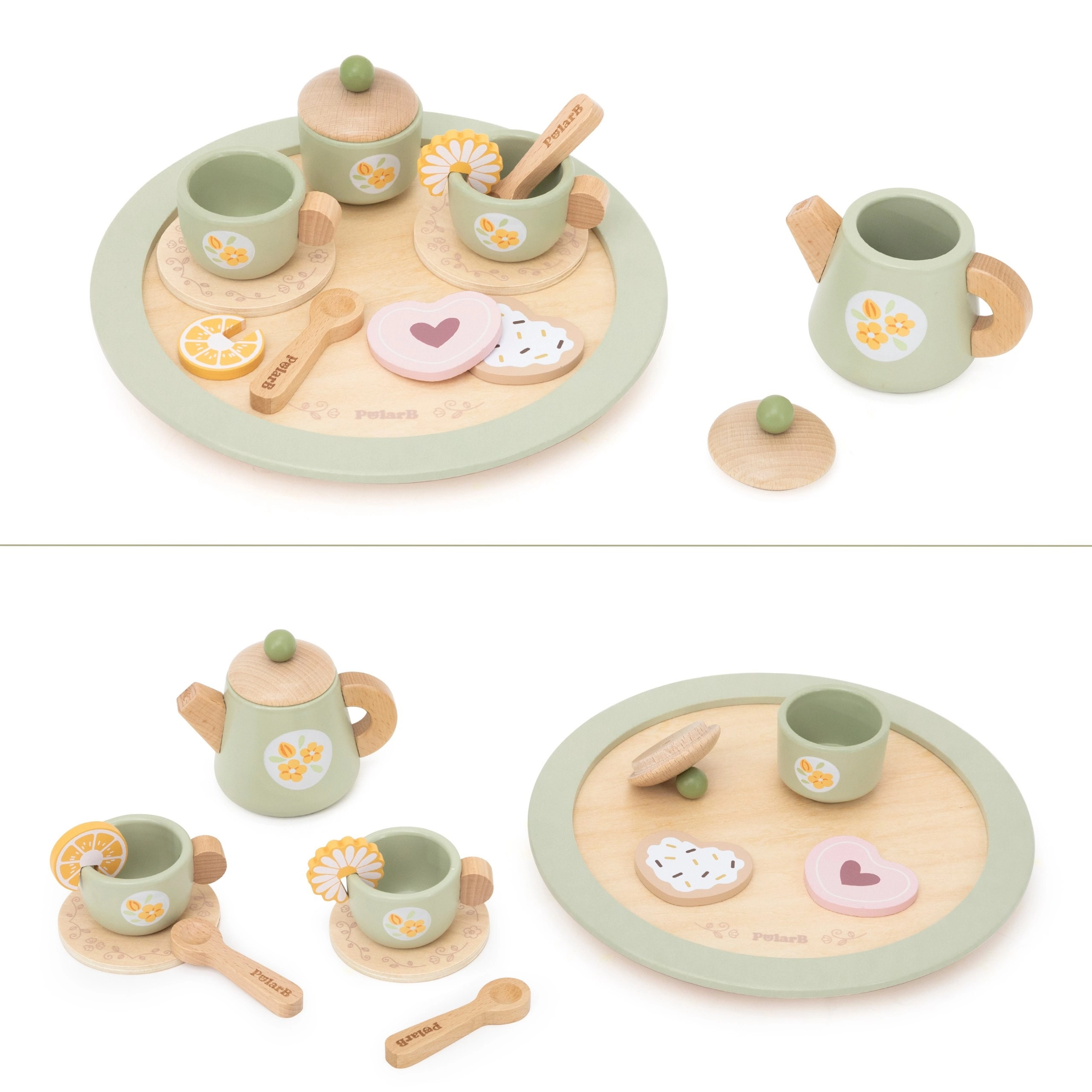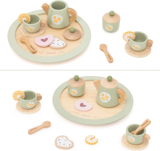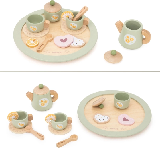 Alles voor een gezellig theemoment is inbegrepen: theepot met deksel, suikerpot, 2 kopjes met schoteltjes, lepeltjes, dessertbordje, schijfjes citroen en koekjes en vooral een stabiel rond dienblad voor eenvoudig serveren. Alles is gemaakt van hoogwaardig hout en afgewerkt met niet-giftige verven, veilig voor kinderen vanaf 3 jaar.