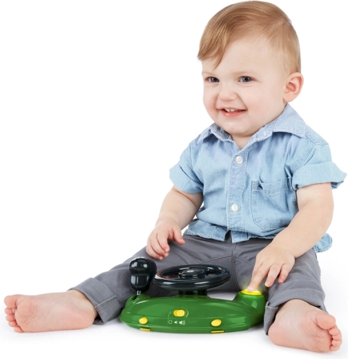 Stuur, versnellingshendel, knoppen, lichteffecten en realistische JOHN DEERE Gator-geluiden stimuleren de verbeelding en de fijne motoriek.