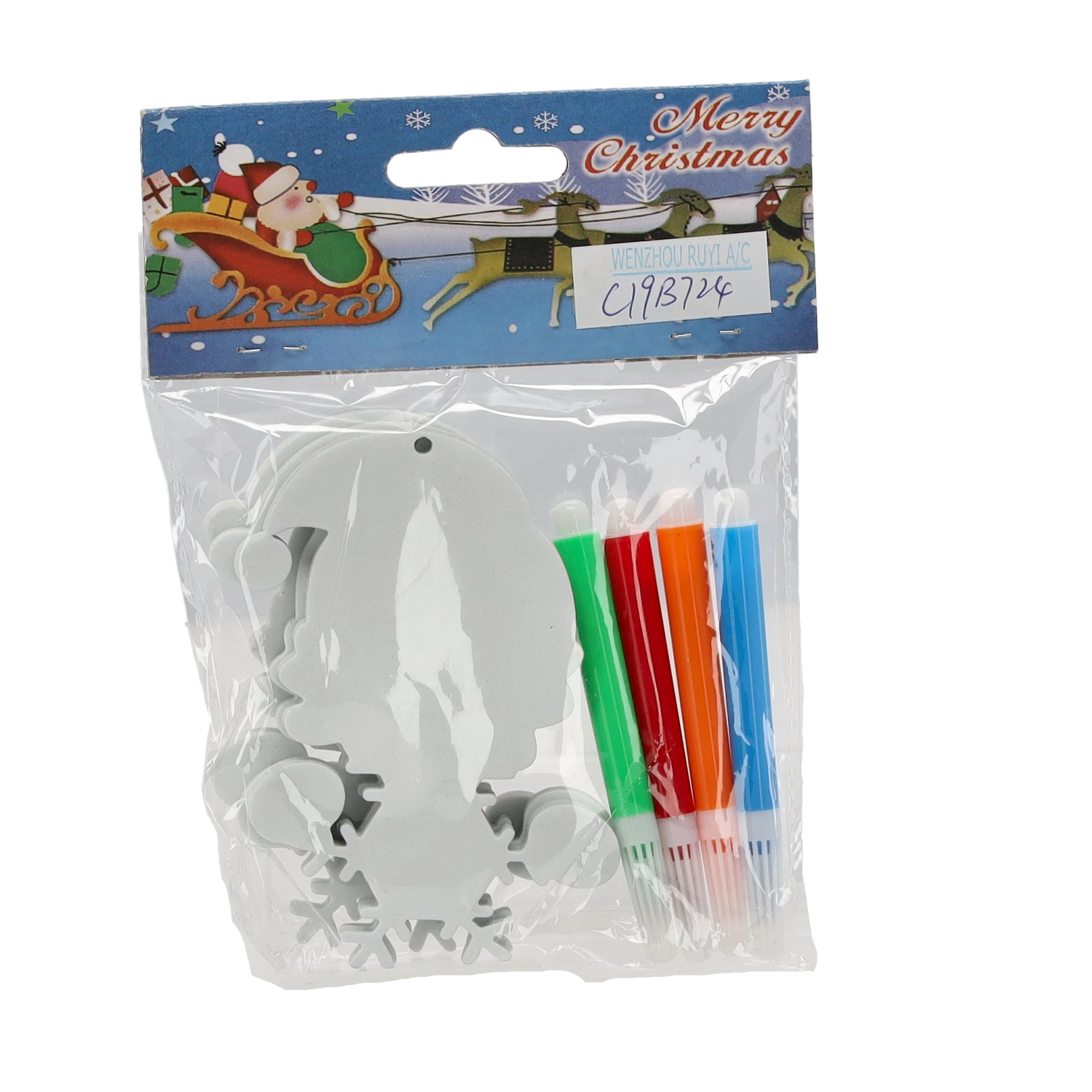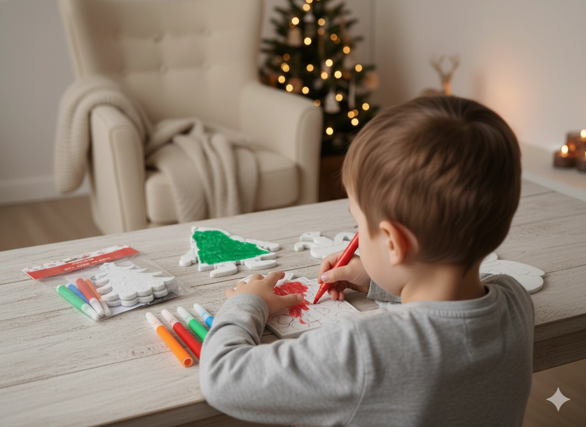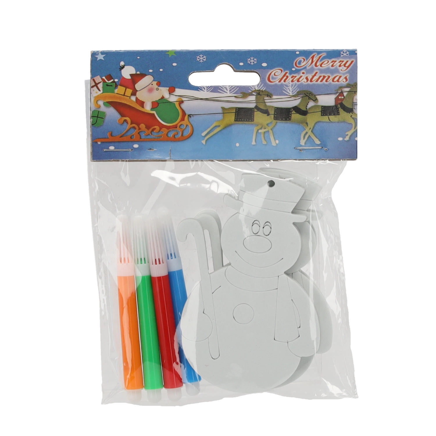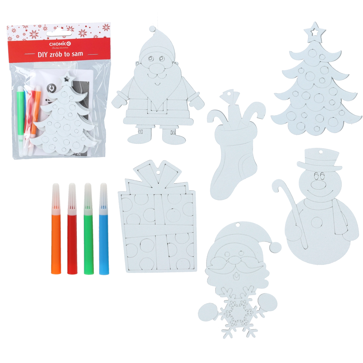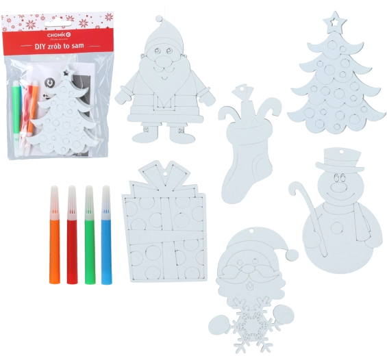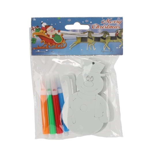 In de verpakking vind je 3 ornamenten om in te kleuren en 4 stiften in vrolijke kleuren – alles direct klaar voor gebruik. De mix van motieven (bijv. sneeuwman, Kerstman, boompje, kerstsok, cadeau) stimuleert creativiteit, fijne motoriek en concentratie. Ideaal voor thuisworkshops, kleuterscholen en vrijetijdsclubs.