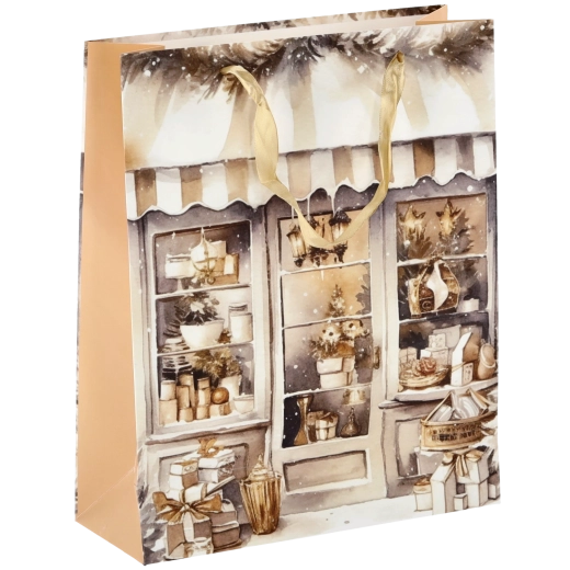 Geef je cadeaus een feestelijke glans. Deze kersttas met een betoverend huisjesmotief heeft een glanzend gelamineerd oppervlak dat de kleuren laat stralen en de verpakking een luxe uitstraling geeft. Dankzij de stevige papieren constructie behoudt de tas zijn vorm en beschermt hij de inhoud tegen kreuken.