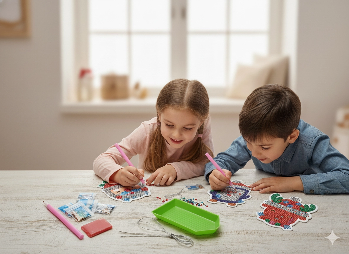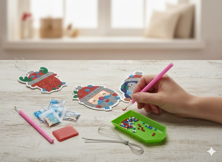 Ontdek een eenvoudige en leuke manier om je eigen kerstdecoraties te maken. De set bevat alles wat je nodig hebt: klevende sjablonen, acrylsteentjes, een schaaltje, was en een applicator. Volg simpelweg de symbolen, plaats de steentjes en in een handomdraai ontstaan sprankelende 3D-ornamenten die elke hoek van je huis laten stralen.