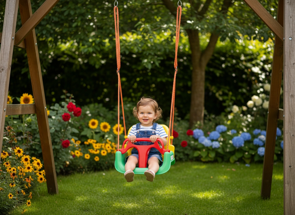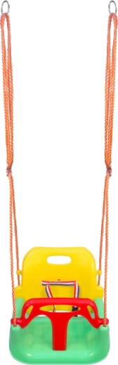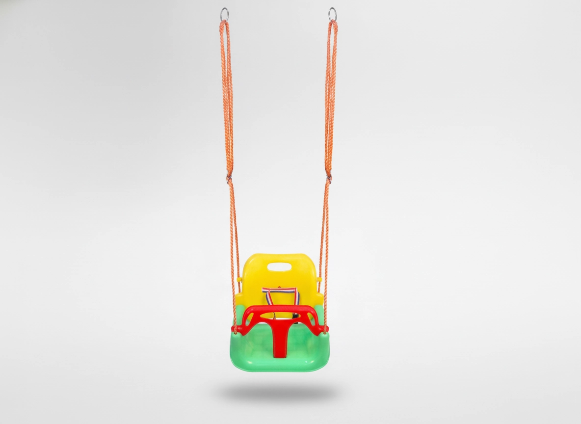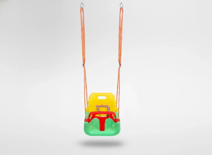 De diepe zitting, hoge rugleuning en de voorste beugel met riem houden het kind comfortabel en veilig, ook bij wat levendiger schommelen.