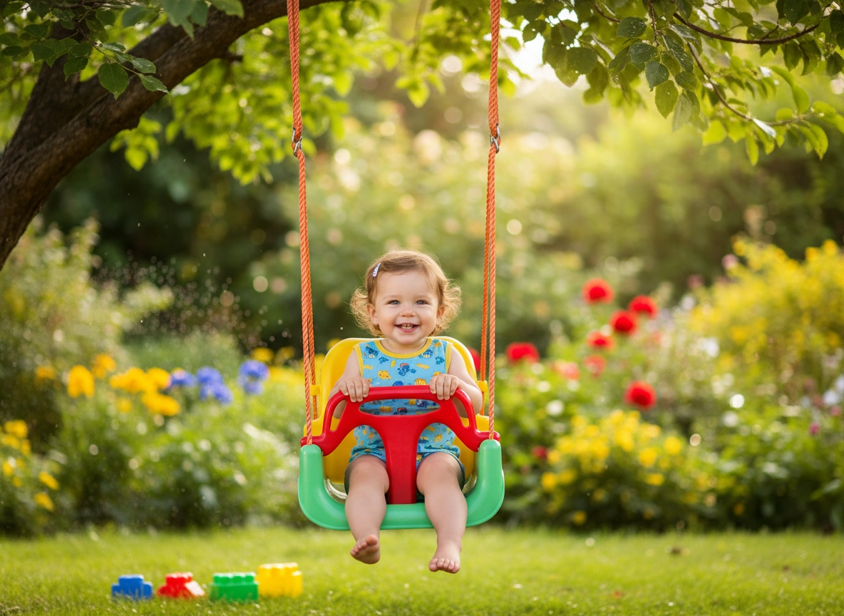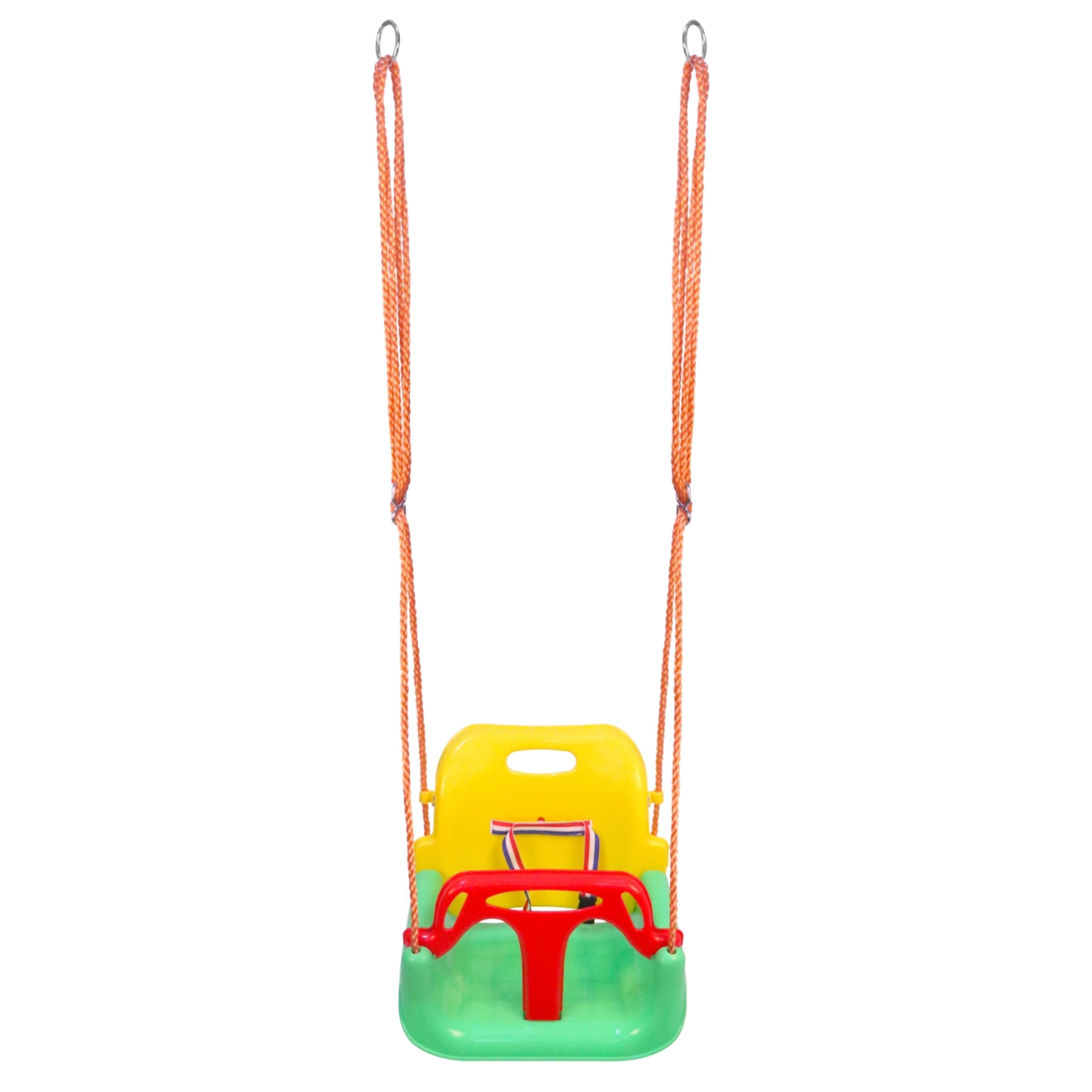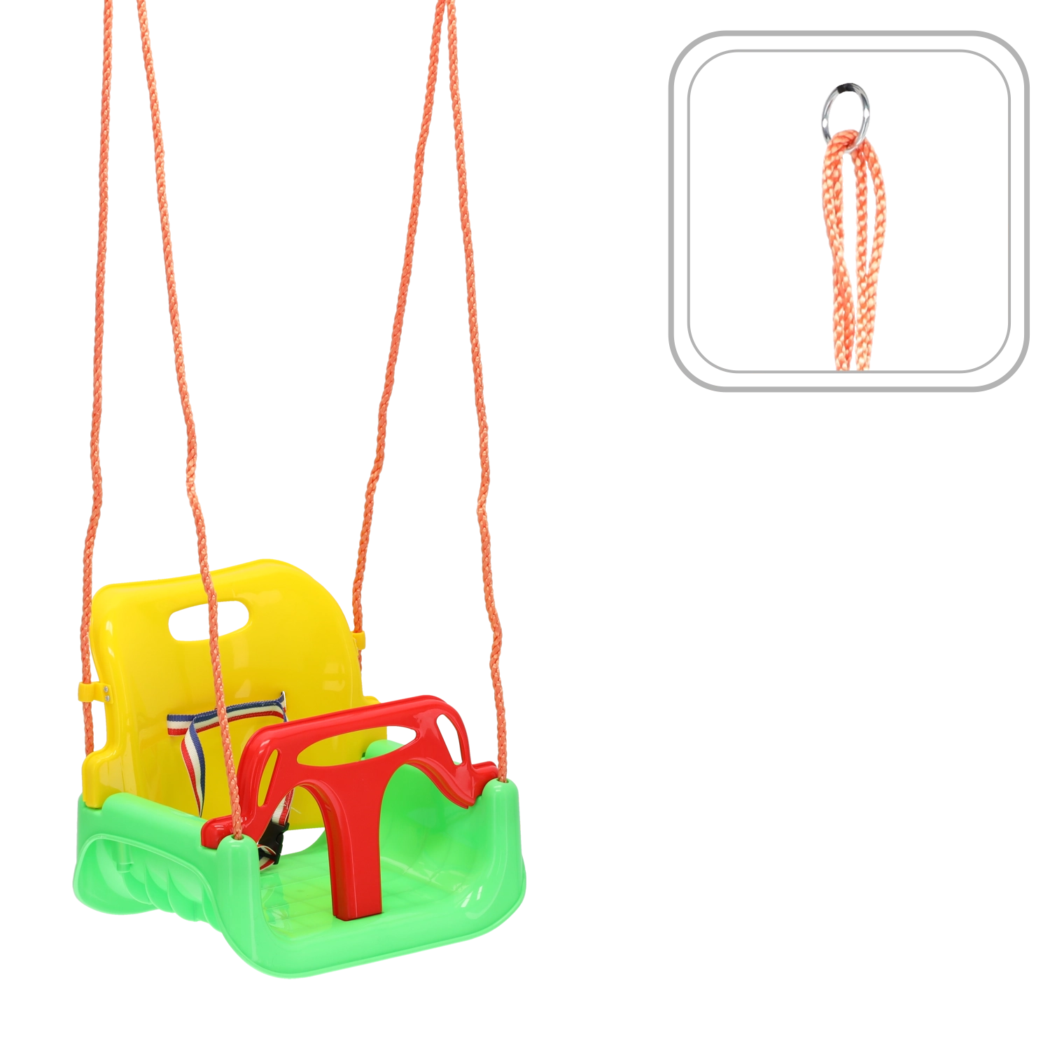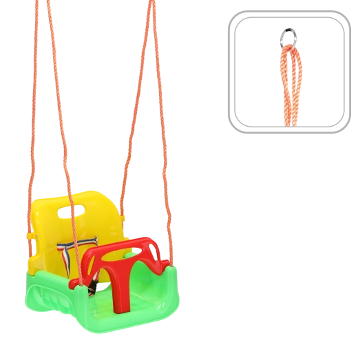 Deze stabiele emmerzit-schommel voor jonge kinderen combineert een hoge mate van veiligheid met plezier. De zitting met hoge rugleuning en de voorste veiligheids-T-bar met sluitriem houden het kind in de juiste positie en maken zorgeloos schommelen mogelijk, zowel binnen als buiten.