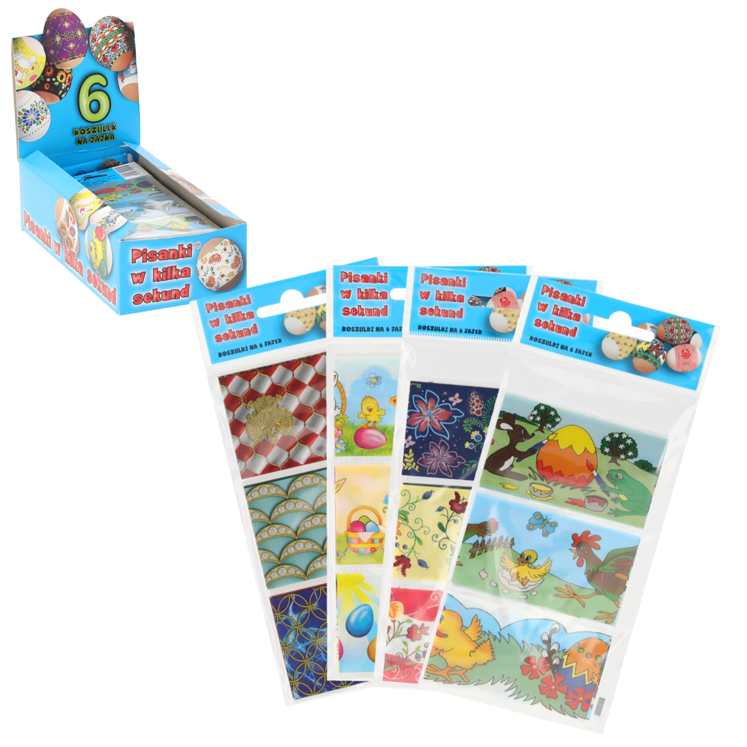 Verander gewone eieren in een oogwenk in bonte paaseieren. De set van 6 krimpfoliehoezen voor paaseieren maakt snelle en eenvoudige decoratie zonder verven of schilderen mogelijk – schuif de hoes om het ei en dompel het kort in heet water.