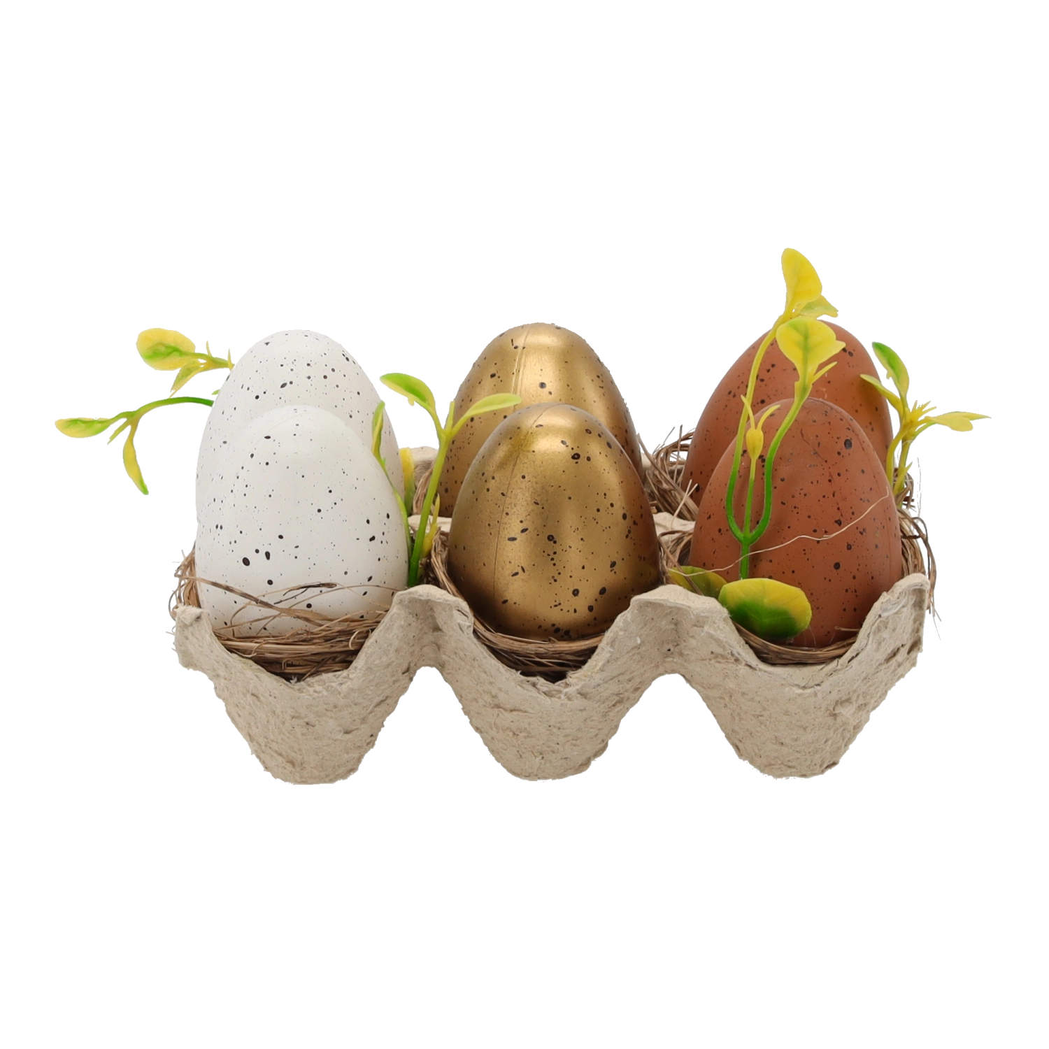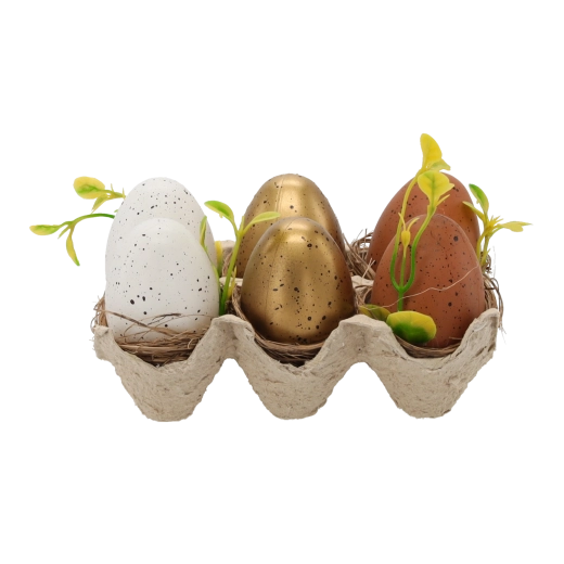 Creëer betoverende paasdecoraties met een set van zes lichte eitjes in pastelkleuren. Elk eitje heeft aan de onderzijde een opening met een diameter van ca. 0,5 cm voor eenvoudige bevestiging aan stokjes of draad. De eitjes worden geleverd in een praktische verpakking die je direct kunt gebruiken in je arrangement. Ideaal voor kransen, schikkingen en knutselen met kinderen.
