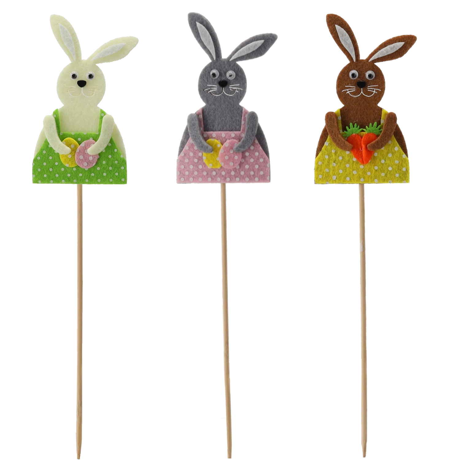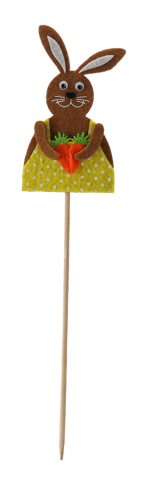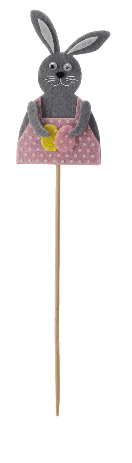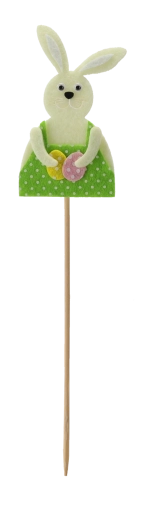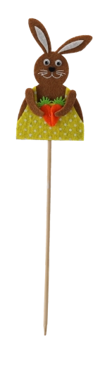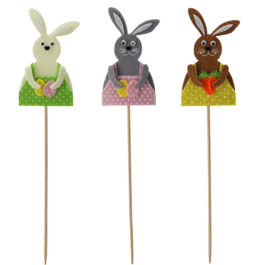 De konijntjes op een houten prikker zijn gemaakt van zachte textiel/vilt met fijne details, waardoor ze een speelse uitstraling hebben en je huis een typische paassfeer geven. Dankzij het slanke stokje plaats je ze gemakkelijk in aarde, steekschuim en tussen bloemstelen, waar ze stevig blijven zitten en mooi uitkomen.